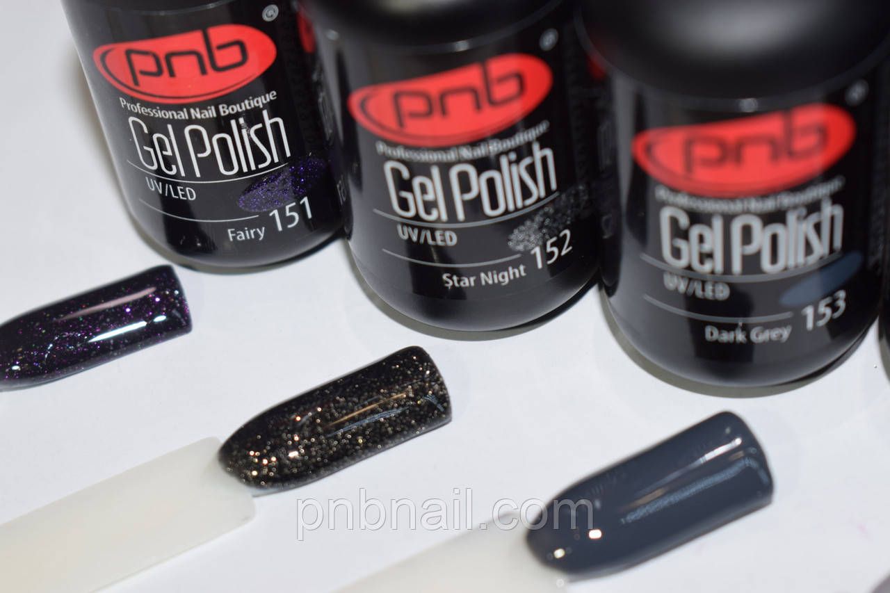 Чорно-фіолетовий з напівпомітним голограмним мерехтінням. Відтінок PNB «Fairy» дуже популярний в осінньо-зимовий період, адже має неймовірний блиск й щільну текстуру. Гель-лак PNB 151 чудово наноситься у 2 шари, а час полімеризації становить 2 хвилини в УФ-лампі або 1 хвилину в світлодіодній лампі. Увага! Колір на малюнку може відрізнятися від справжнього.