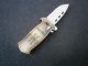 Лезвие ножа выдвигается и фиксируется кнопкой. Зажигалка расположена на конце ручки.