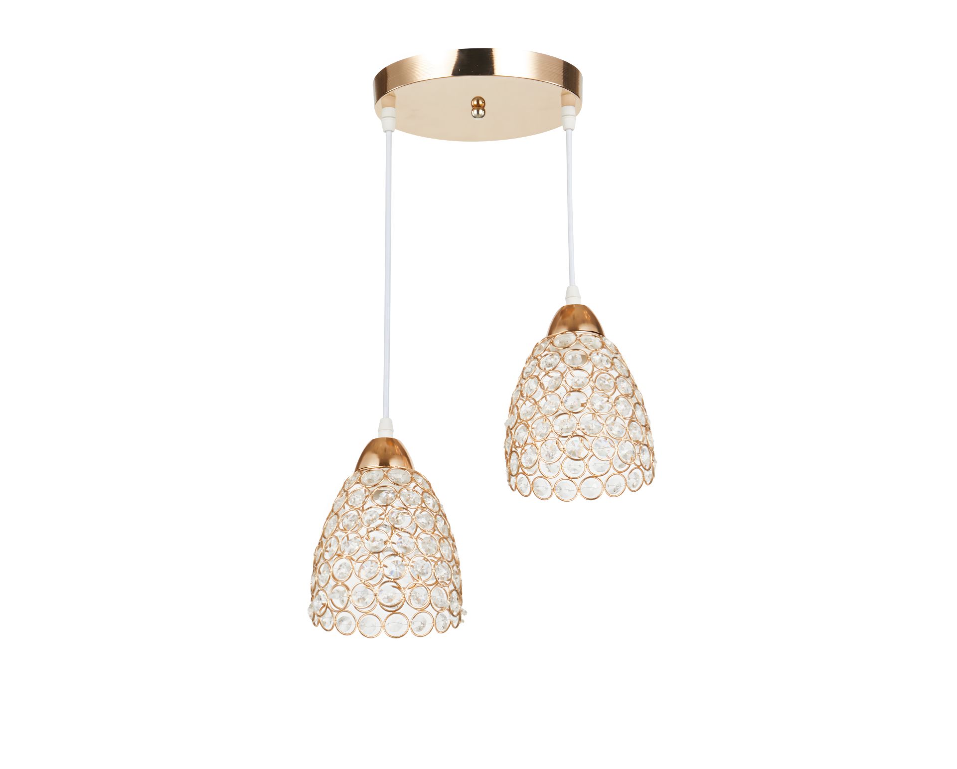Люстра подвесная INTEREES IS 6180-2 FG – декоративный светильник с двумя подвесными плафонами, полностью украшенными прозрачными хрусталиками в теплом золотом обрамлении (French Gold). Кристаллы преломляют и рассеивают свет, создавая приятное мерцание и придавая простору глубины и уюта.