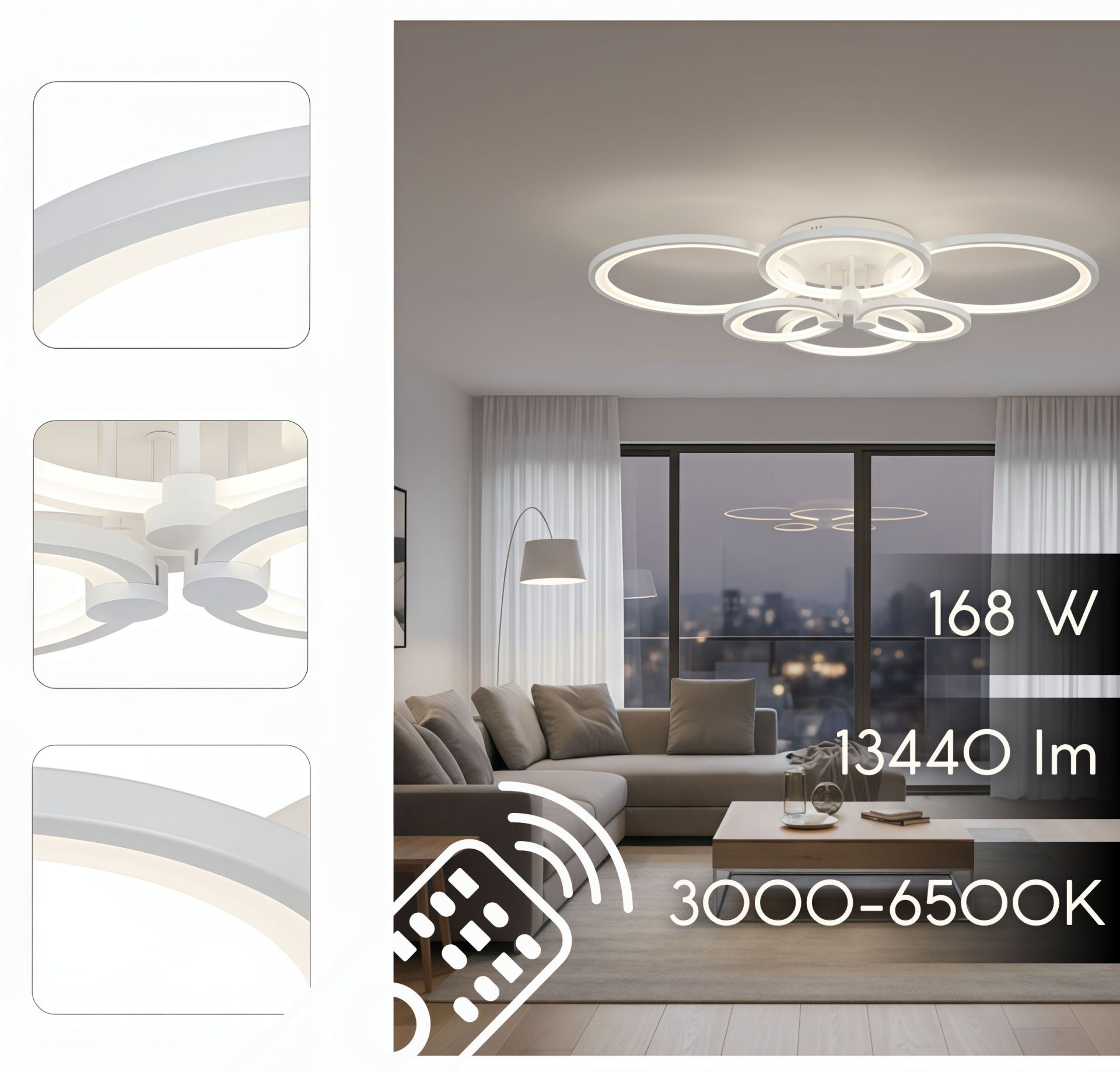 Мощное LED-освещение 168W обеспечивает яркий световой поток 13440 люмен, позволяя осветить даже большие комнаты. Цветовая температура регулируется от тёплого 3000K до холодного 6500K, а удобный пульт дистанционного управления позволяет изменять яркость и температуру света по желанию.
