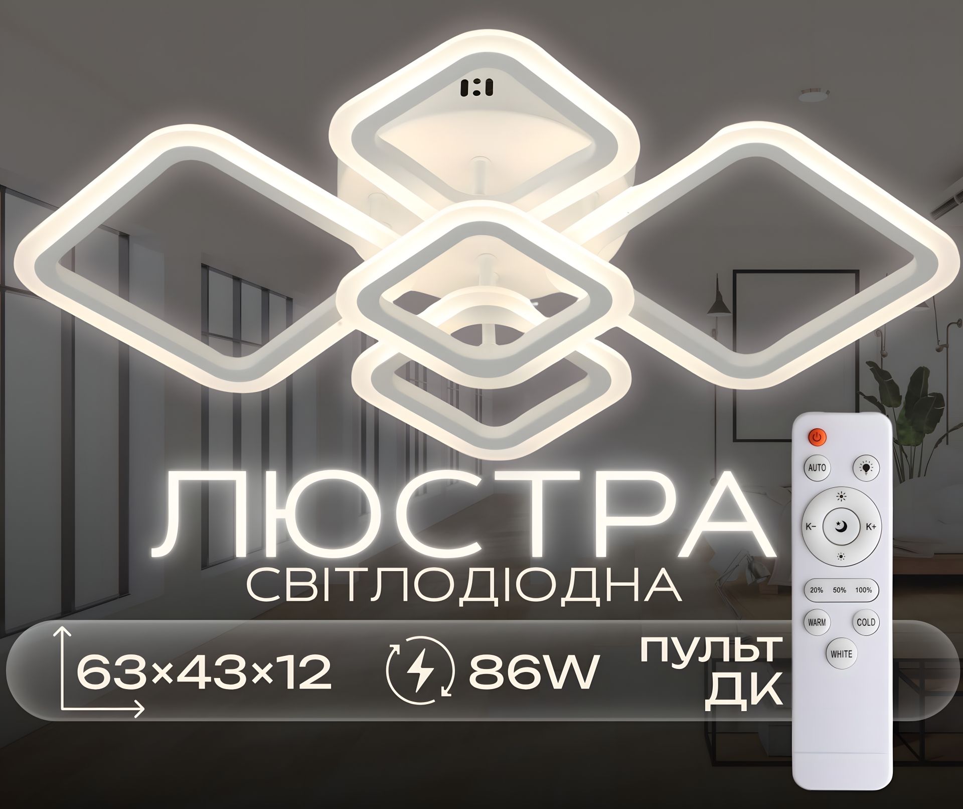 Светильник оснащён LED-модулями общей мощностью 86W (43W×2 основных источника света + дополнительные декоративные элементы), которые обеспечивают яркое освещение с возможностью настройки цветовой температуры от 3000K до 6500K. Удобное управление освещением с помощью пульта дистанционного управления (IR Remote).