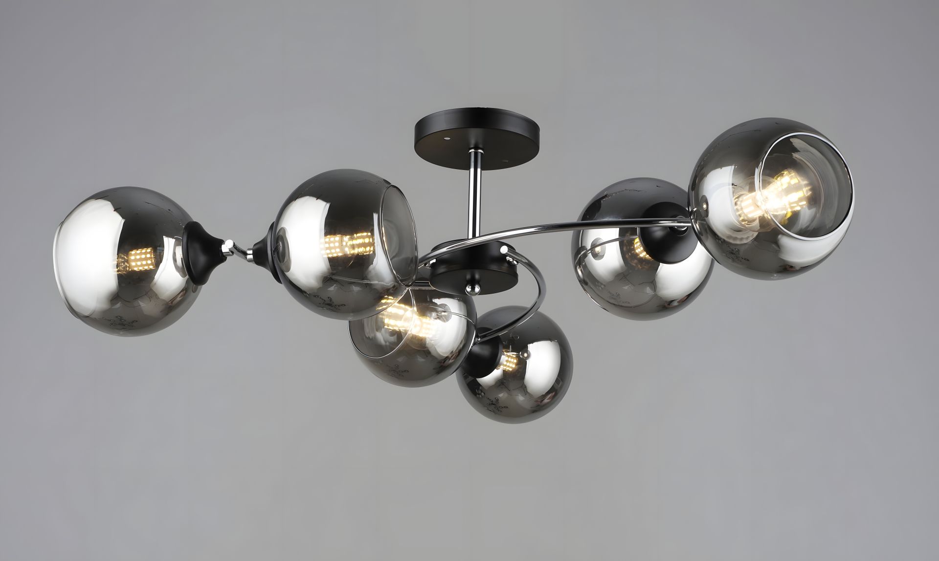 Модель оснащена металлическим основанием цвета хром и чёрными прозрачными плафонами, которые придают интерьеру глубину и стиль. Отличный выбор для гостиной, столовой или офисного помещения.