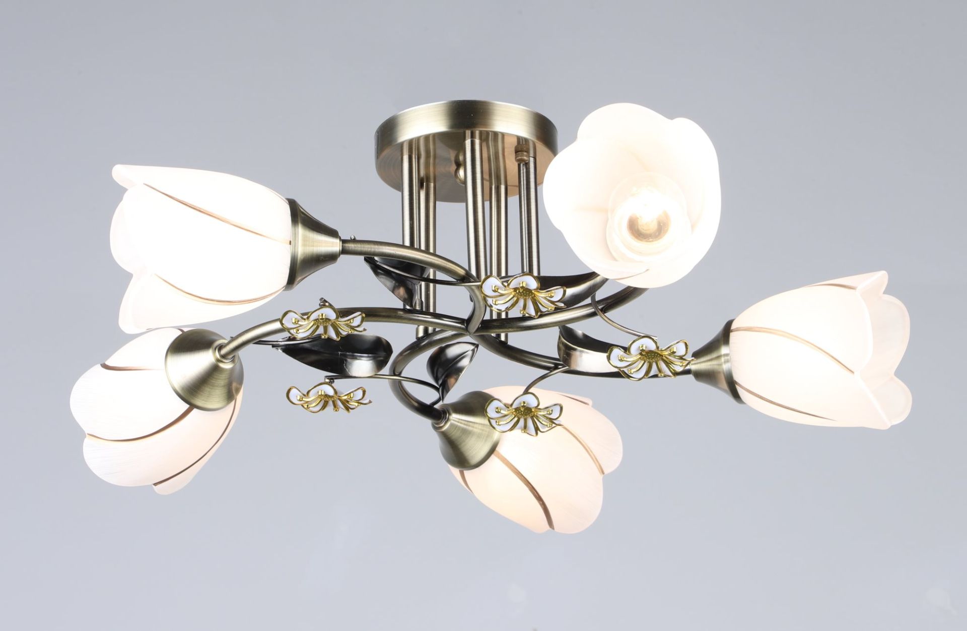 B N1508/5 AB — изящная люстра с бронзовым каркасом и стеклянными плафонами в форме цветов. Такой дизайн создаёт уютную атмосферу в помещении и добавляет интерьеру элегантности. Плафоны в виде цветков придают люстре нежный вид, а отсутствие ламп в комплекте позволяет выбрать цветовую температуру по своему вкусу.