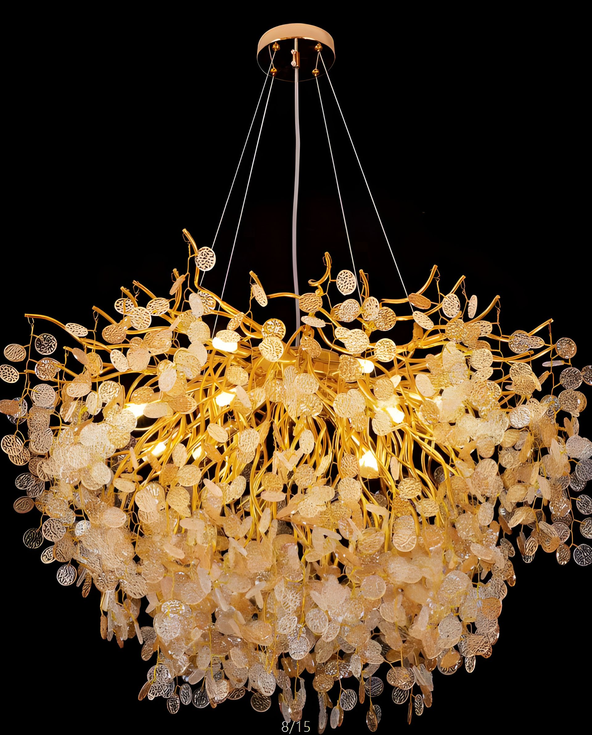 Роскошная подвесная люстра WM-7002 500-G9*6-52 GD сочетает прозрачный хрусталь с янтарными оттенками, создавая уютное и мягкое свечение. Основание выполнено в золотом цвете, придавая люстре изысканный и благородный вид. Эта модель станет стильным акцентом для гостиной, зала или просторного холла.