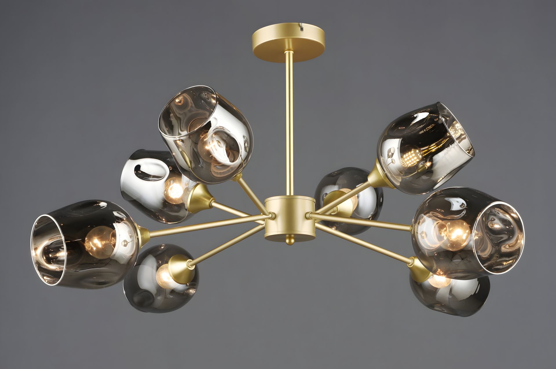Элегантная люстра на 8 плафонов — роскошное украшение вашего интерьера. Сдержанный, но эффектный золотой цвет, прозрачные стеклянные плафоны и изящная форма придают модели лёгкость и изысканность. Отлично подойдёт для просторных помещений, холлов, ресторанов или отелей.