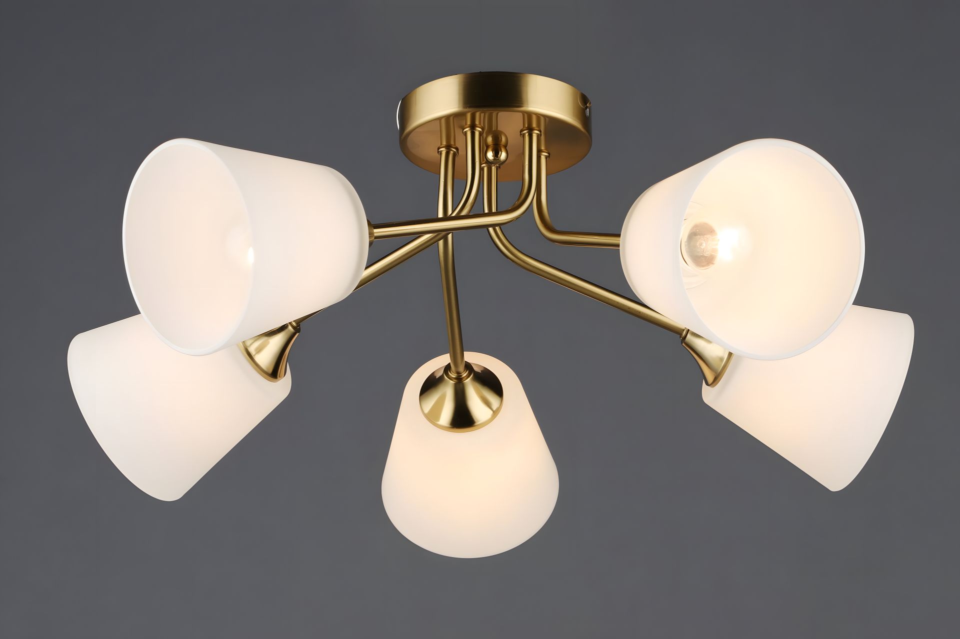 Пятиламповая люстра в медном цвете — сочетание классики и современного стиля. Благодаря стеклянным абажурам и тёплому оттенку металла она создаёт мягкое, равномерное освещение и отлично подходит для зонального и общего света.