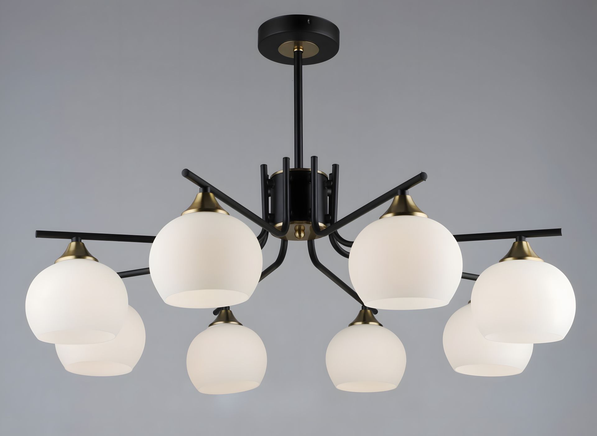 Современная потолочная люстра на 8 ламп — яркий акцент для стильного интерьера. Чёрный металл с тёплой медью создают гармоничную пару, а стеклянные плафоны придают конструкции лёгкость. Модель идеально подойдёт для гостиной, столовой, лофт-пространства или ресторанного залу.