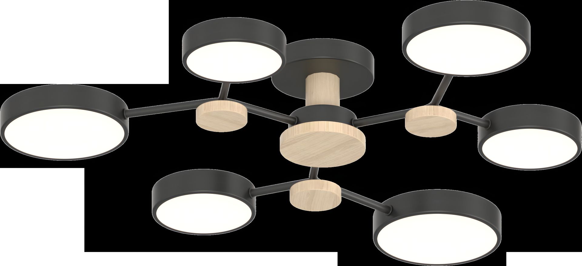 Современный потолочный светильник в стильном сочетании чёрного цвета и деревянных элементов. Оснащён LED-платой для равномерного и яркого освещения. Отлично подойдёт для гостиной, спальни или кухни. Имеет три режима цветовой температуры: тёплый, нейтральный и холодный белый. Пульт дистанционного управления отсутствует.