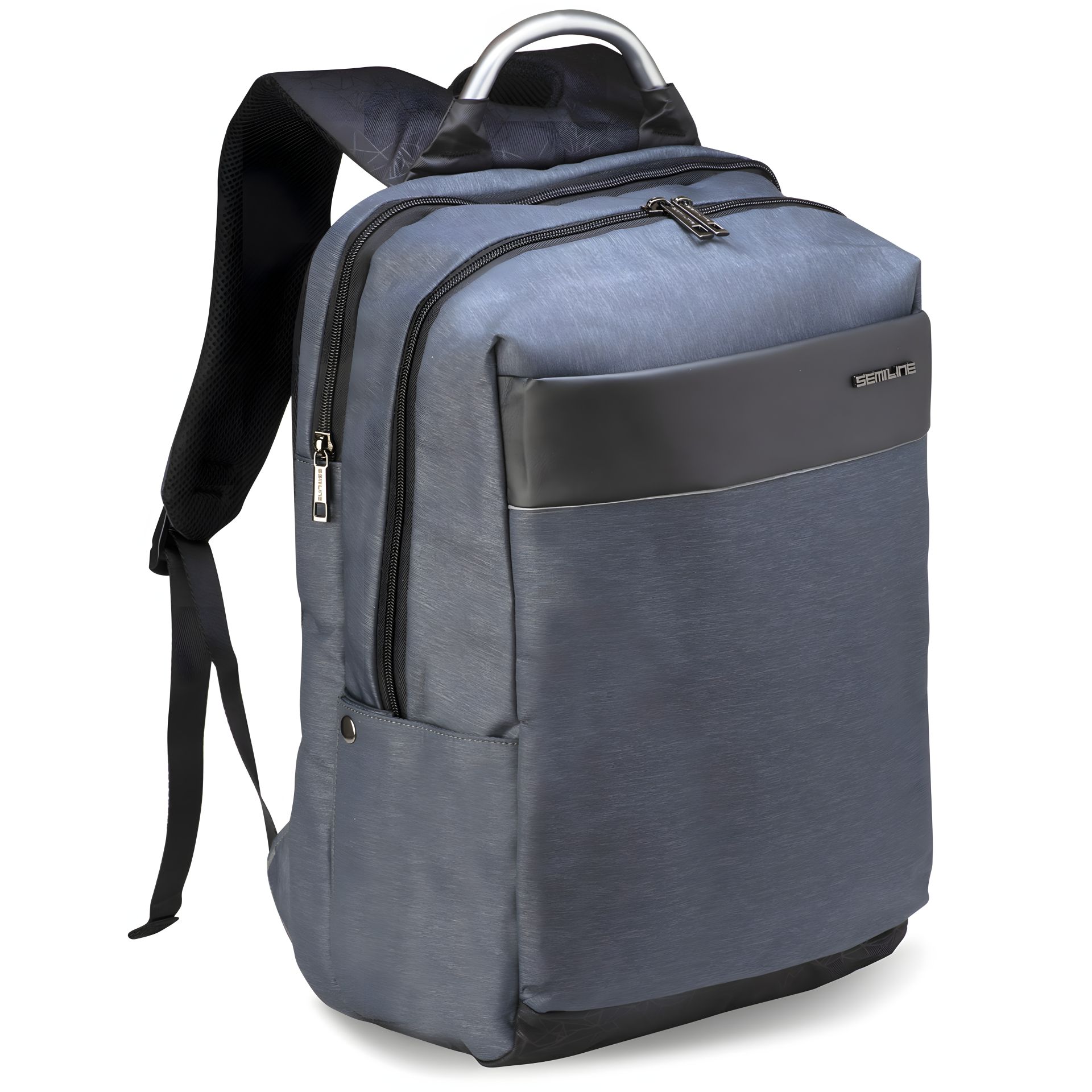 Основное отделение вмещает ноутбук диагональю до 15.6 дюймов, а также имеет отдельную секцию для планшета и органайзеры для аксессуаров. Передний отдел предназначен для документов формата A4 и оснащен двумя внутренними карманами с подкладкой. По бокам - два кармана на кнопках, а на спинке - потайной карман на молнии. Нижняя часть оснащена резиновыми ножками для лучшей устойчивости и защиты дна. Верхняя металлическая ручка добавляет элегантности и удобства в переноске. Задняя часть имеет специальную ленту для крепления рюкзака к чемодану.