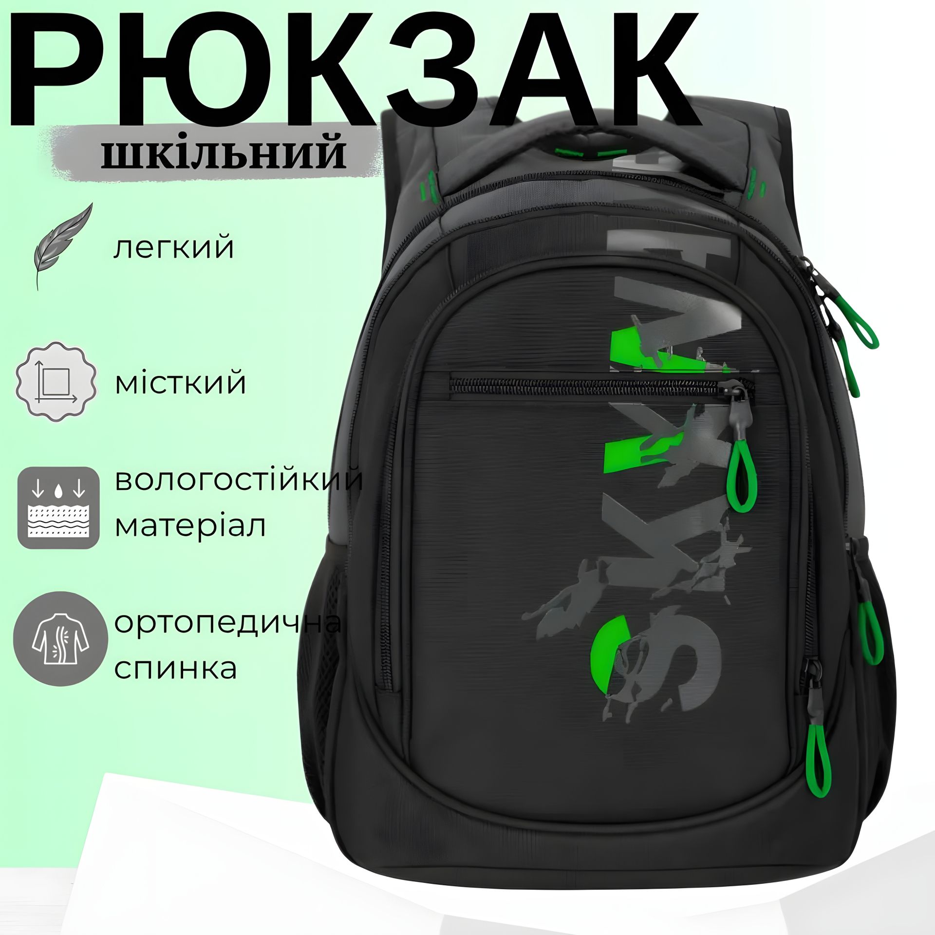 Рюкзак школьный Sky Name (Winner) для подростков, 3 отдела, черный с зеленым