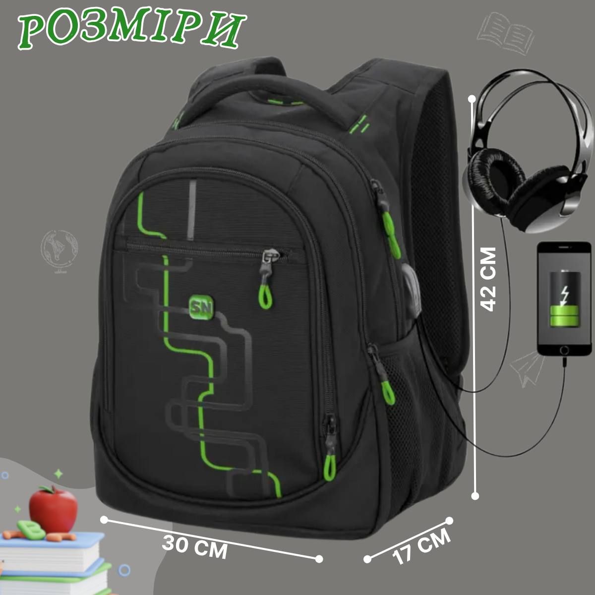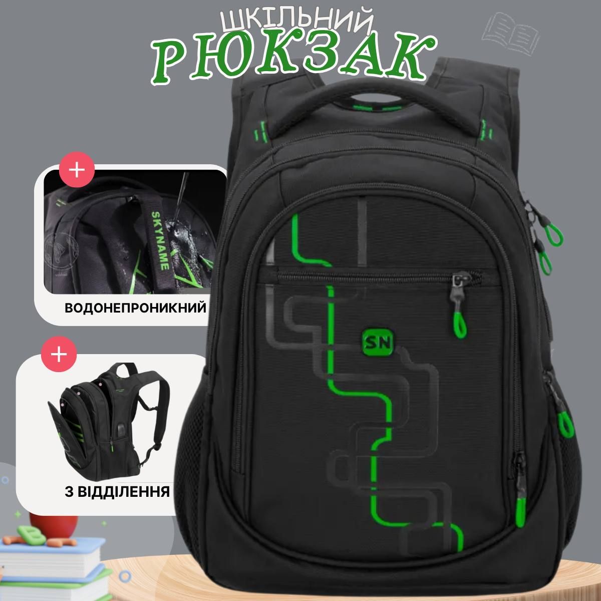 Школьный рюкзак Winner/SkyName для подростков с USB-слотом, черный, на 3 отделения
