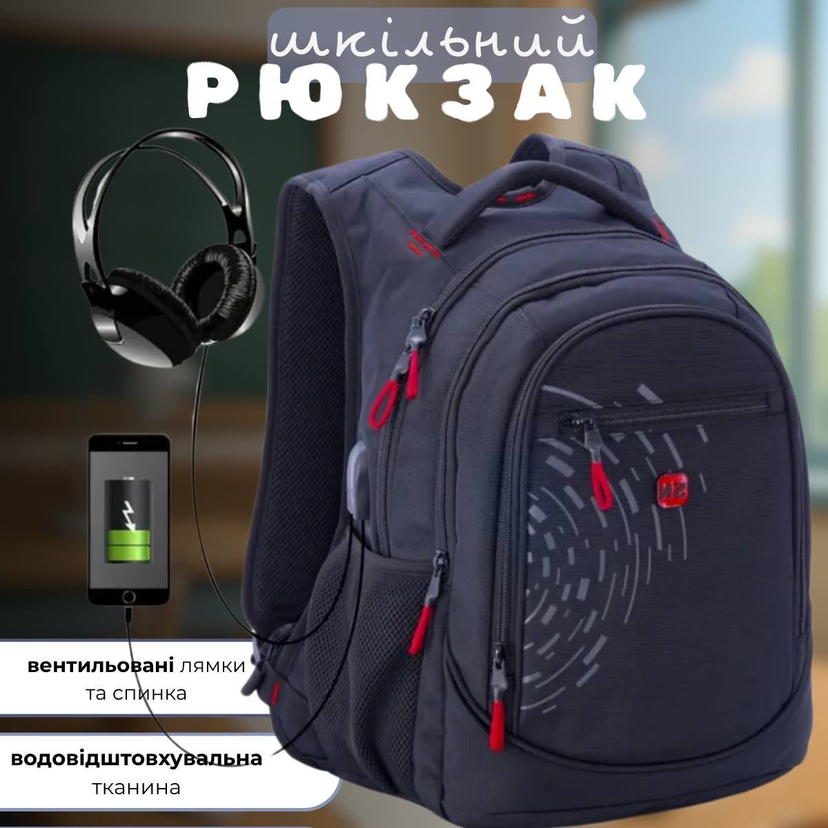 Школьный рюкзак Winner/SkyName для подростков с USB-слотом, черный с красным, на 3 отделения