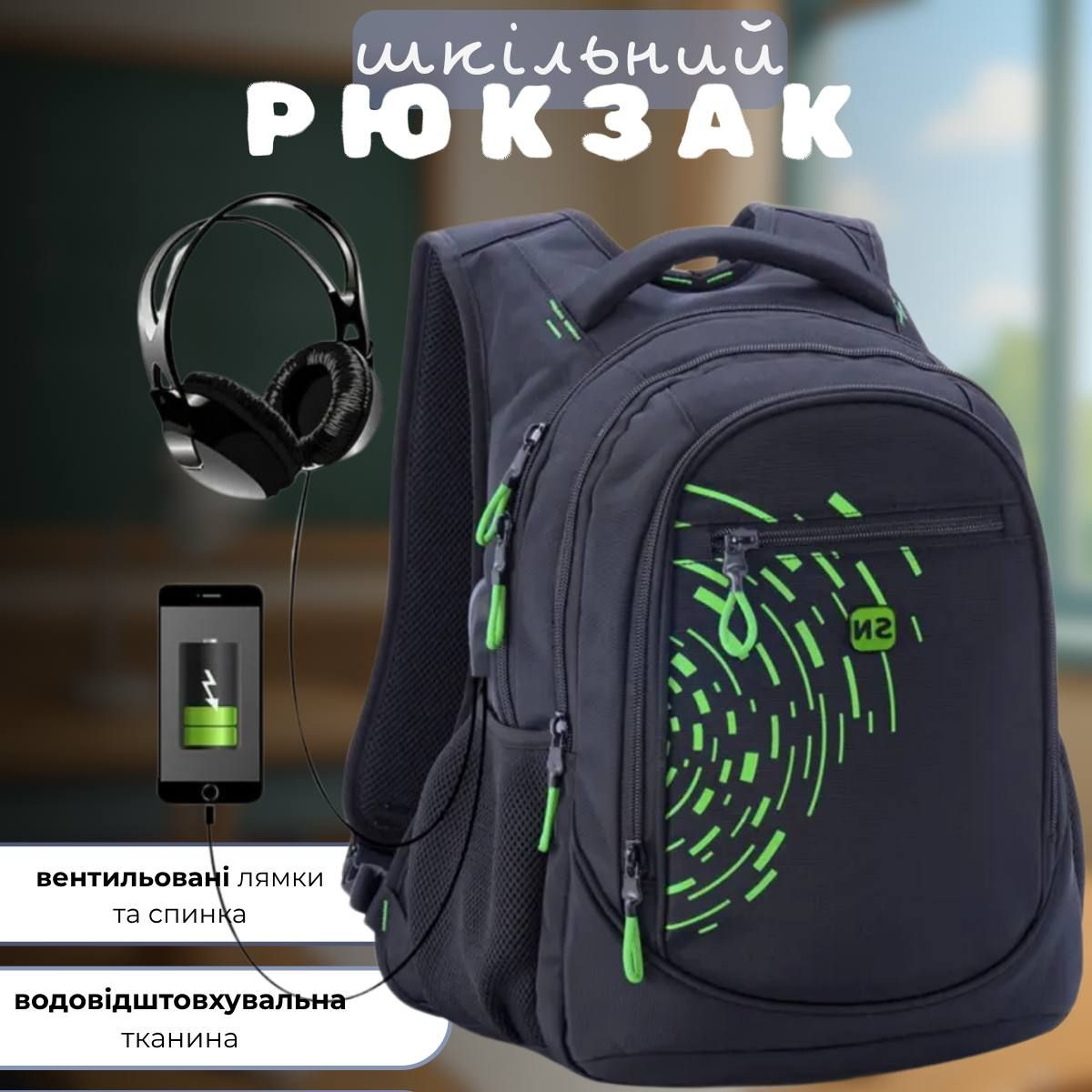 Школьный рюкзак Winner/SkyName для подростков с USB-слотом, черный с зеленым, на 3 отделения