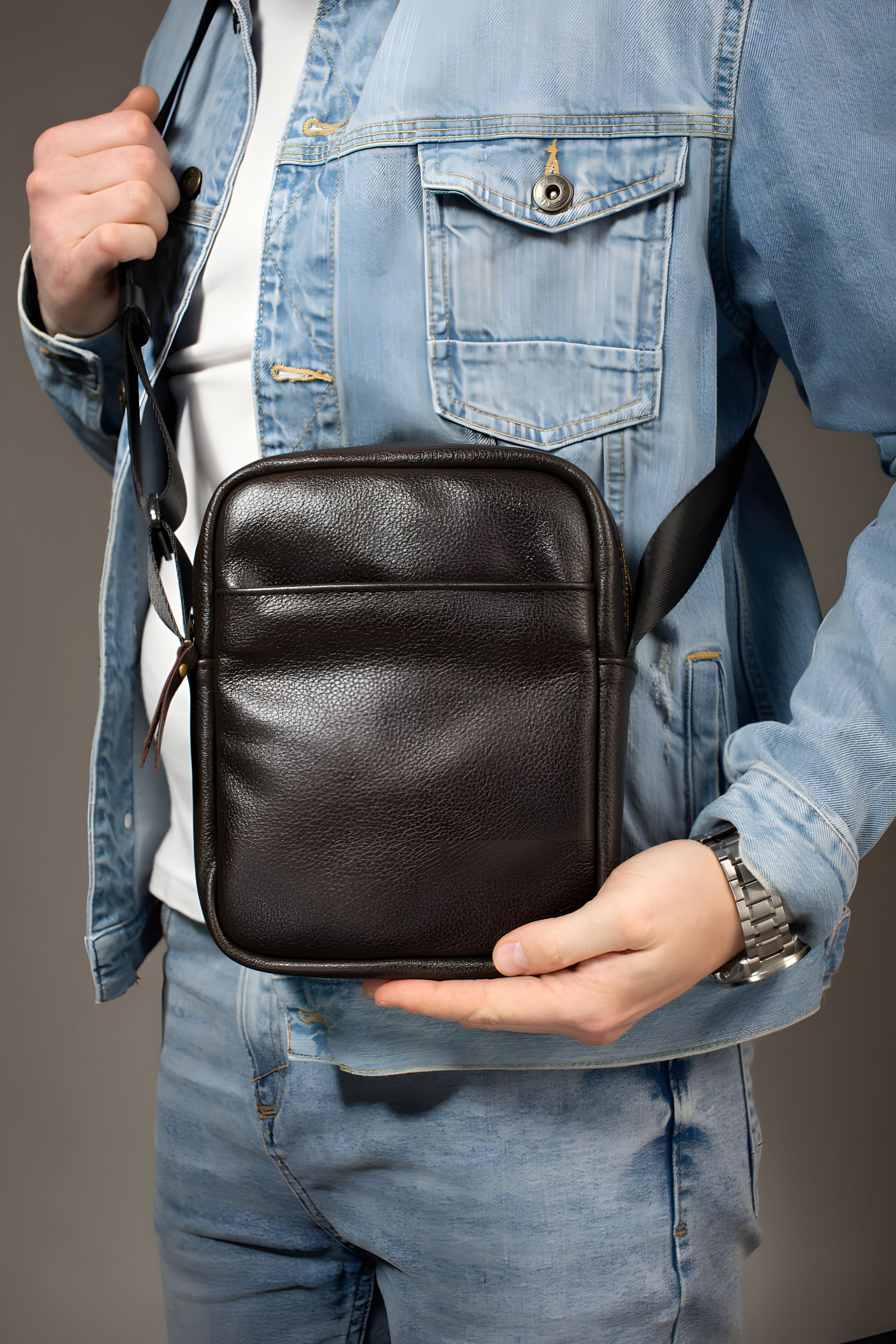 Ця чоловіча сумка-мессенджер виготовлена з натуральної шкіри преміум-якості, що надає їй вишуканого вигляду та довговічності. Глибокий коричневий колір підкреслює статусність і легко поєднується з будь-яким стилем – від класичного до casual. Сумка ідеально підходить для повсякденного використання: містке основне відділення, зручні кишені для гаджетів, документів та інших необхідних речей. Регульований ремінь через плече забезпечує комфорт навіть при тривалому носінні. Вибираючи цю модель, ви отримуєте не просто аксесуар, а надійного помічника для динамічного життя. СТРУКТУРА: • одне основне відділення на молнії • одна кишеня з лицьової сторони на молнії • одна кишеня з тильної сторони на молнії • одна внутрішня кишеня без застібки • одна внутрішня кишеня для карток