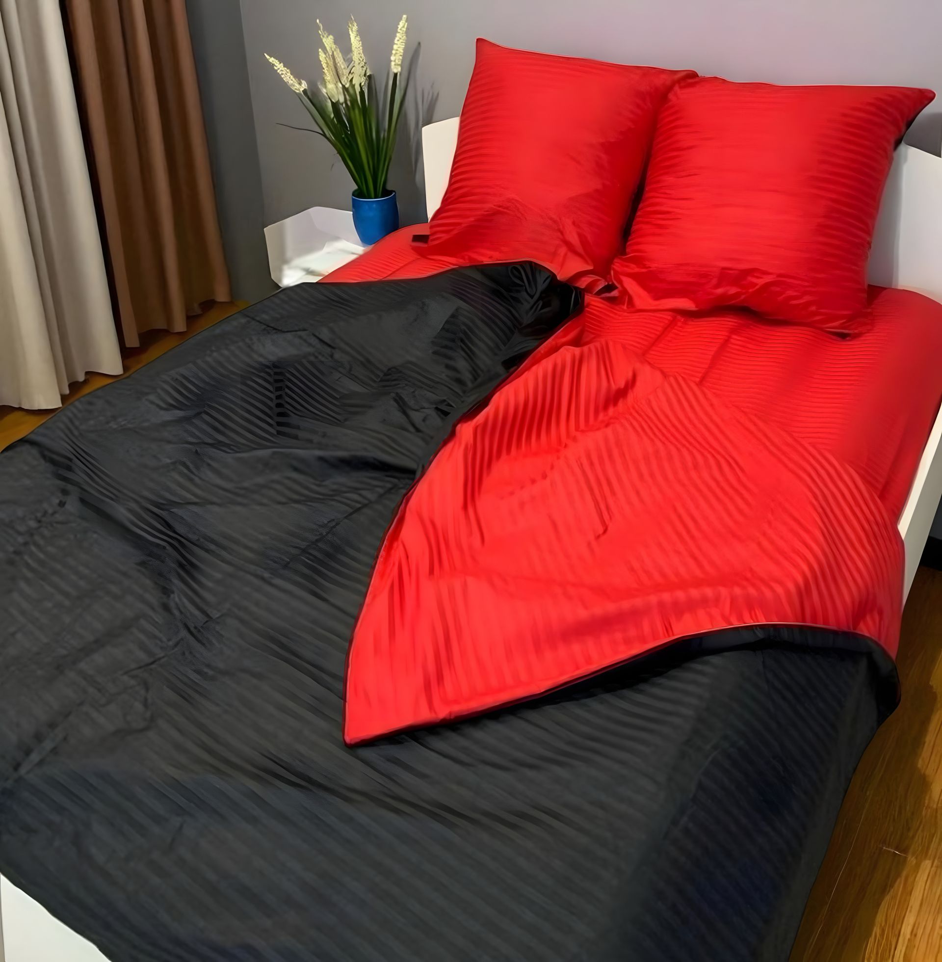 Подарите своей спальне характер! Сочетание глубокого черного и страстного красного — это не просто постель, это стиль, который говорит сам за себя. А страйп-сатин добавляет ощущение роскоши, которой хочется наслаждаться каждую ночь.
