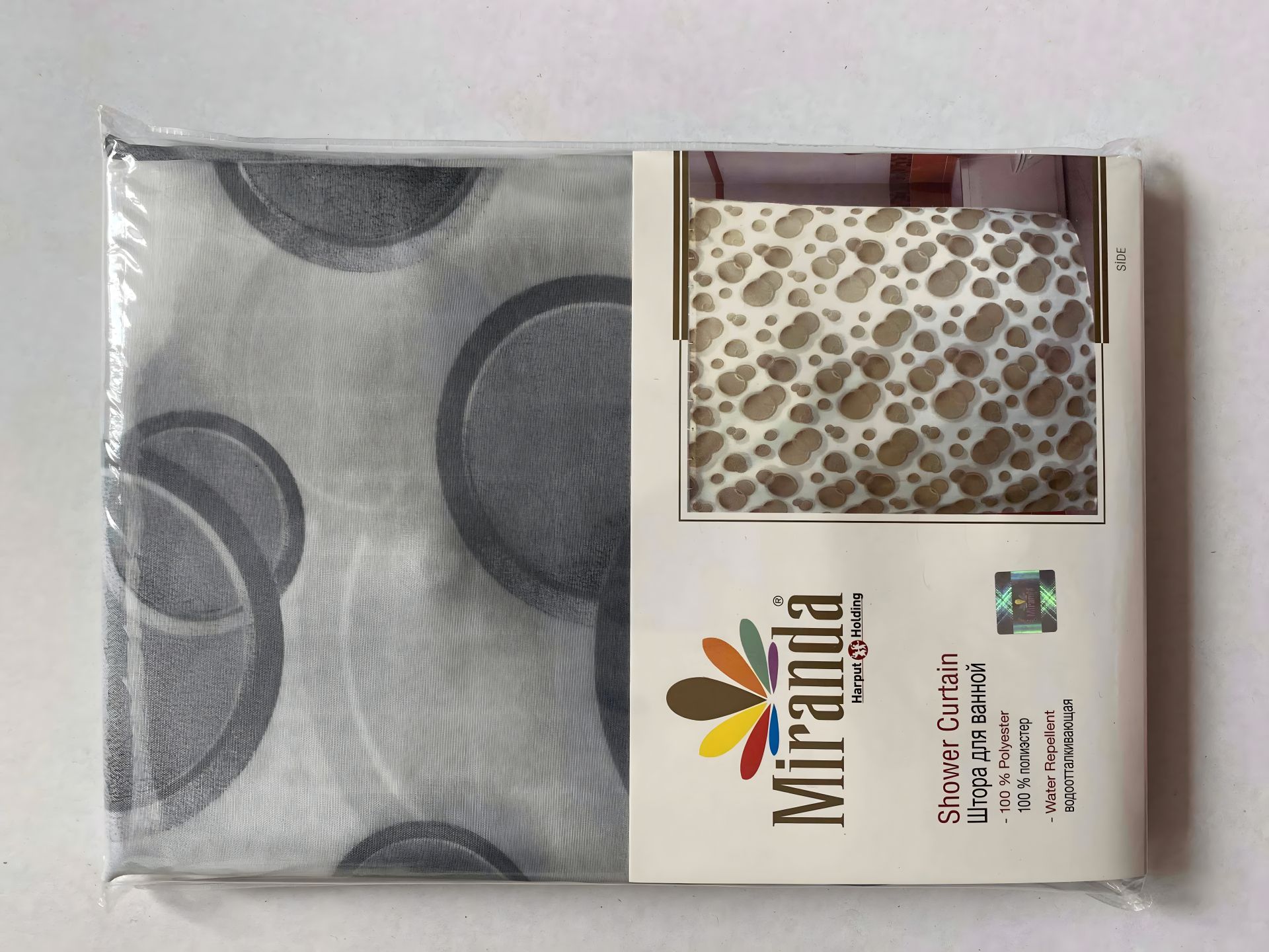 Занавесная занавес и душ Миранды, приготовленная Турцией. Композиция 100% полиэстера (ткань с водной пропиткой). Отличное качество, не теряет своего первоначального внешнего вида даже после повторной промывки. Отверстия под кольцами обрабатываются пластиком. В комплекте нет колец, их можно купить дополнительно.