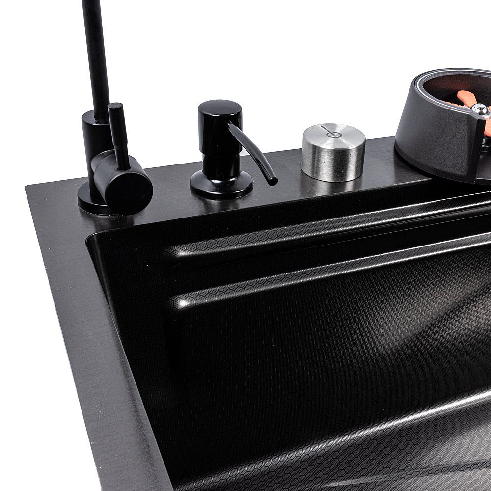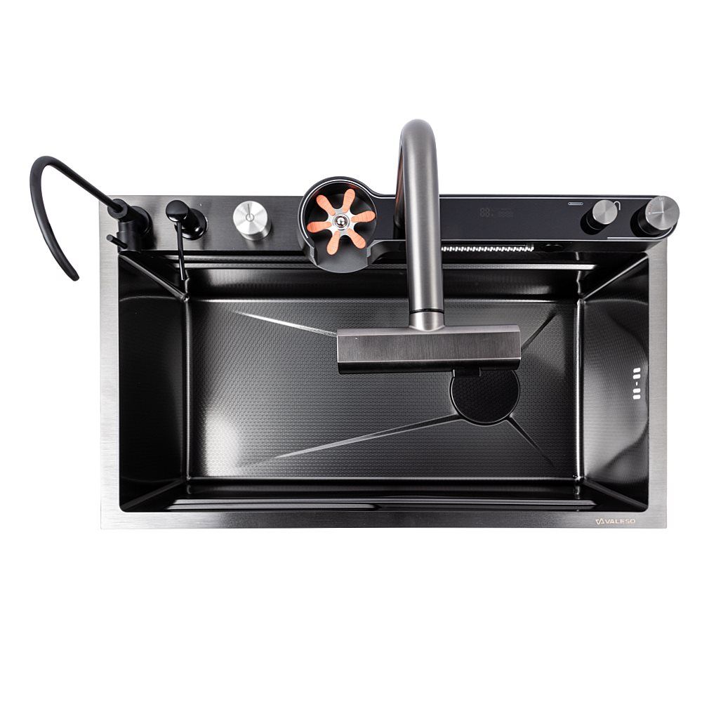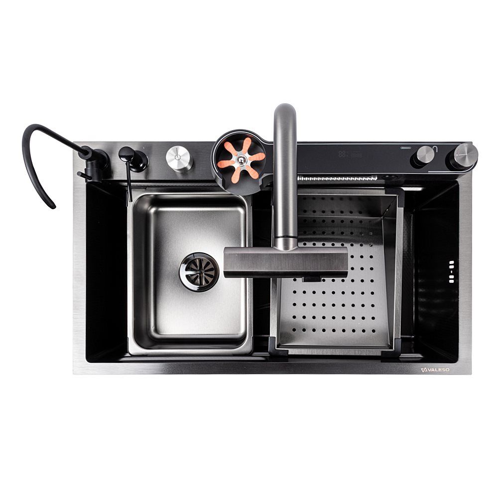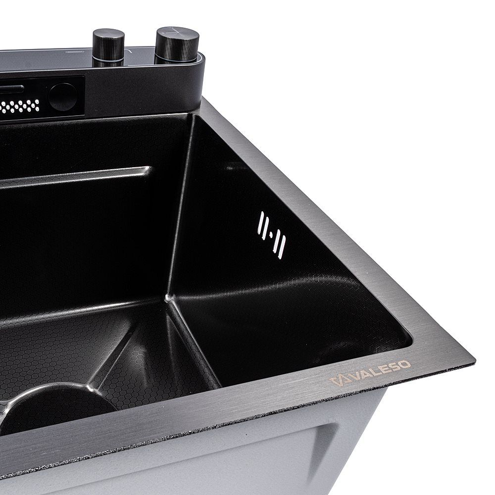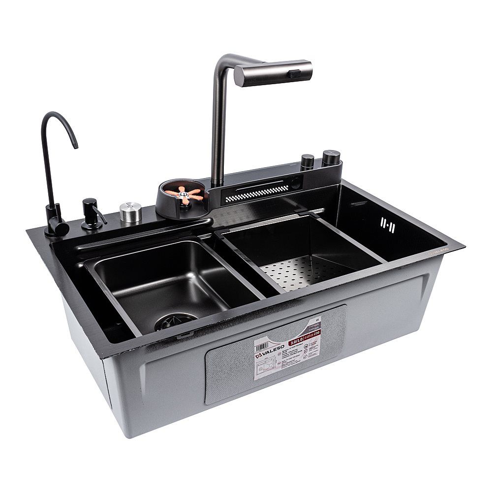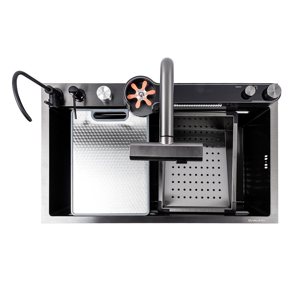 Превратите свою кухню в многофункциональную рабочую станцию с инновационной мойкой VALESO Handmade "Водопад" в роскошном PVD черном исполнении. Эта модель сочетает в себе стильный современный дизайн и полный набор функций, делающих кулинарные процессы максимально комфортными.