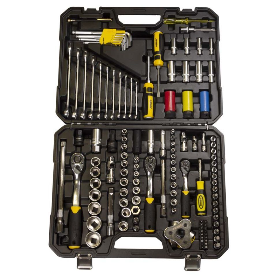 Стоит отметить, что в комплектация набора дополнена захватом магнитным телескопическим, для захвата деталей и элементов крепежа при необходимости извлечь их из труднодоступных мест. Универсальность набора увеличивает наличие съемника для масляного фильтра, индикатора напряжения, ударных отверток, комбинировнных и шестигранных ключей. Также мы добавили головку для разборки стоек, что делает данную комплектации эксклюзивной на рынке.