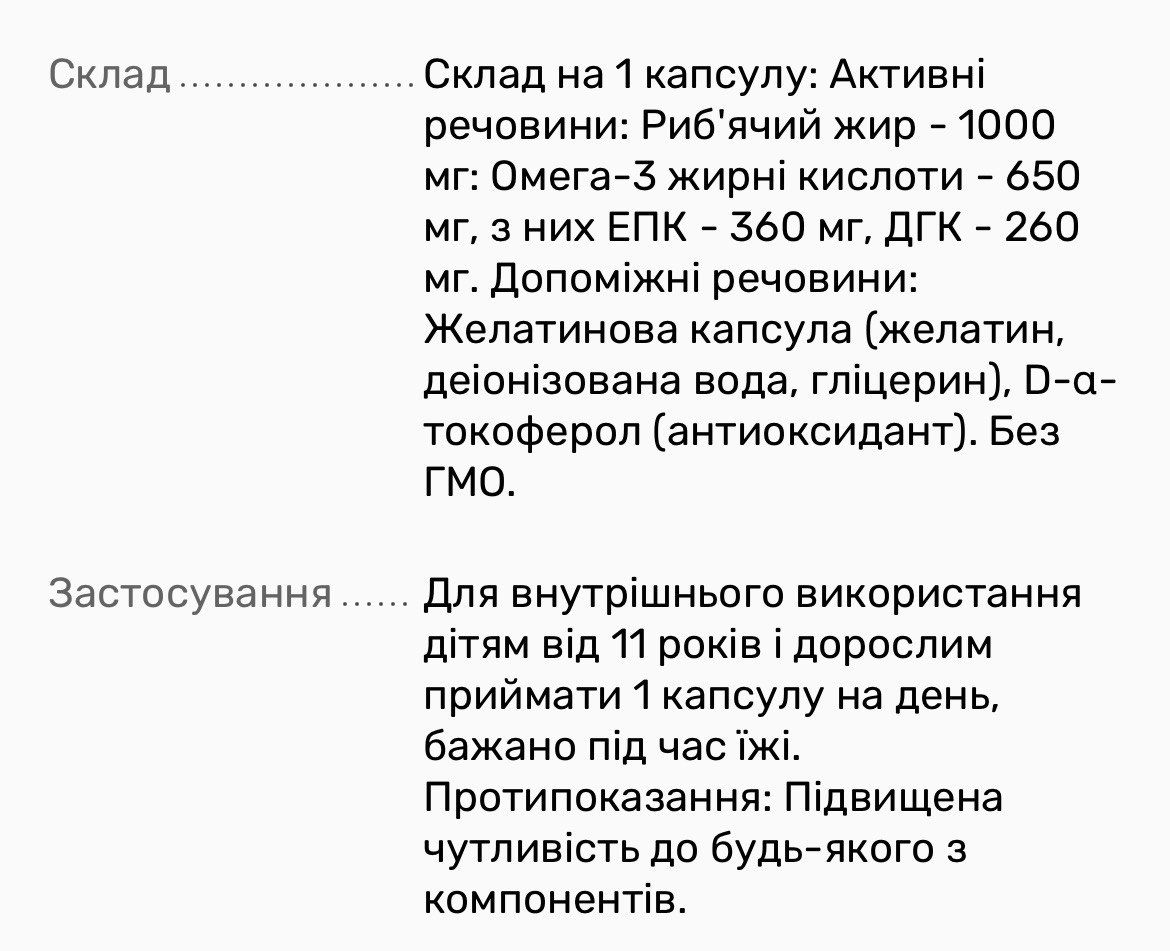 Диетическая добавка Омега 3 содержит 1000 мг высококачественного рыбьего жира в каждой желатиновой капсуле, в частности 360 мг ЭПК (эйкозапентаеновой кислоты) и 260 мг ДГК (докозагексаеновой кислоты).