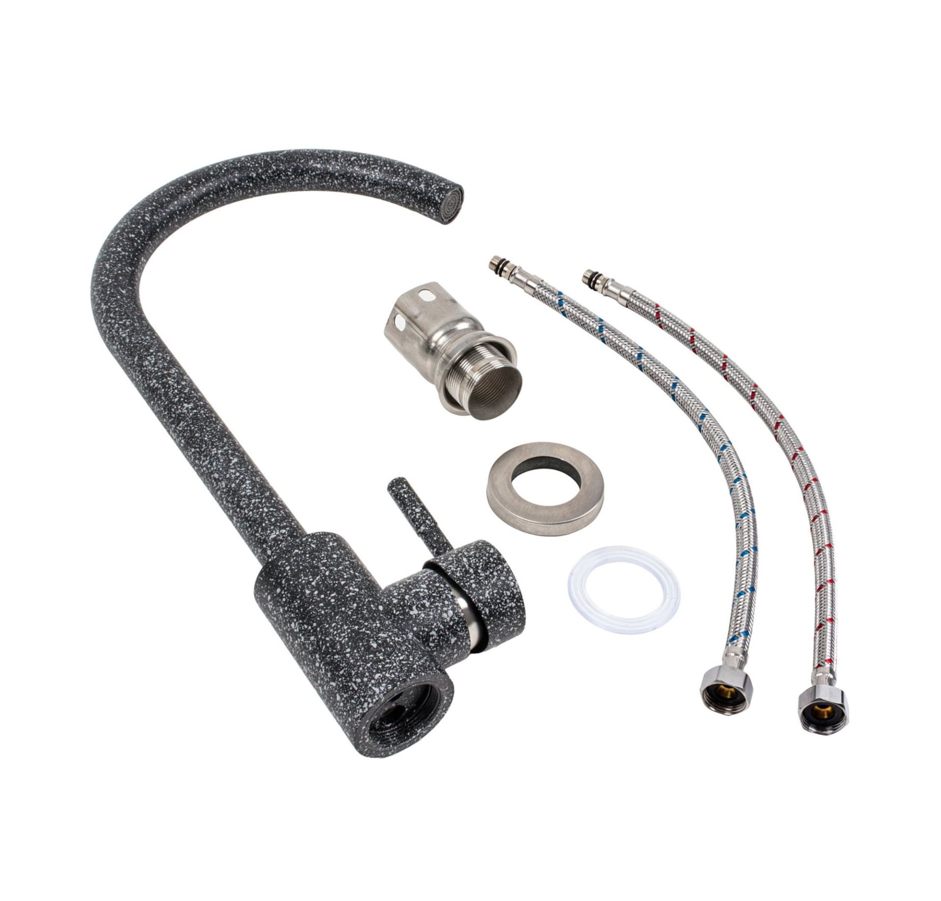 Элегантный смеситель 56 B NESP "графит" Идеальное дополнение к мойке — смеситель 56 B NESP в цвете "графит". Его изящный дизайн и высокая функциональность станут украшением вашей кухни. Благодаря высоте 330 мм и длине излива 200 мм, он позволяет с легкостью наполнять любую посуду. Смеситель изготовлен из нержавеющей стали SUS304, что гарантирует его устойчивость к коррозии и длительный срок службы.