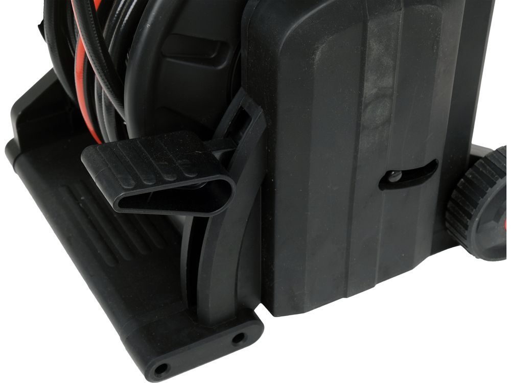 Ножная педаль, изготовленная из крепкого материала, эффективно сматывает шланг после завершения работы, не спутывая его и не сгибая.