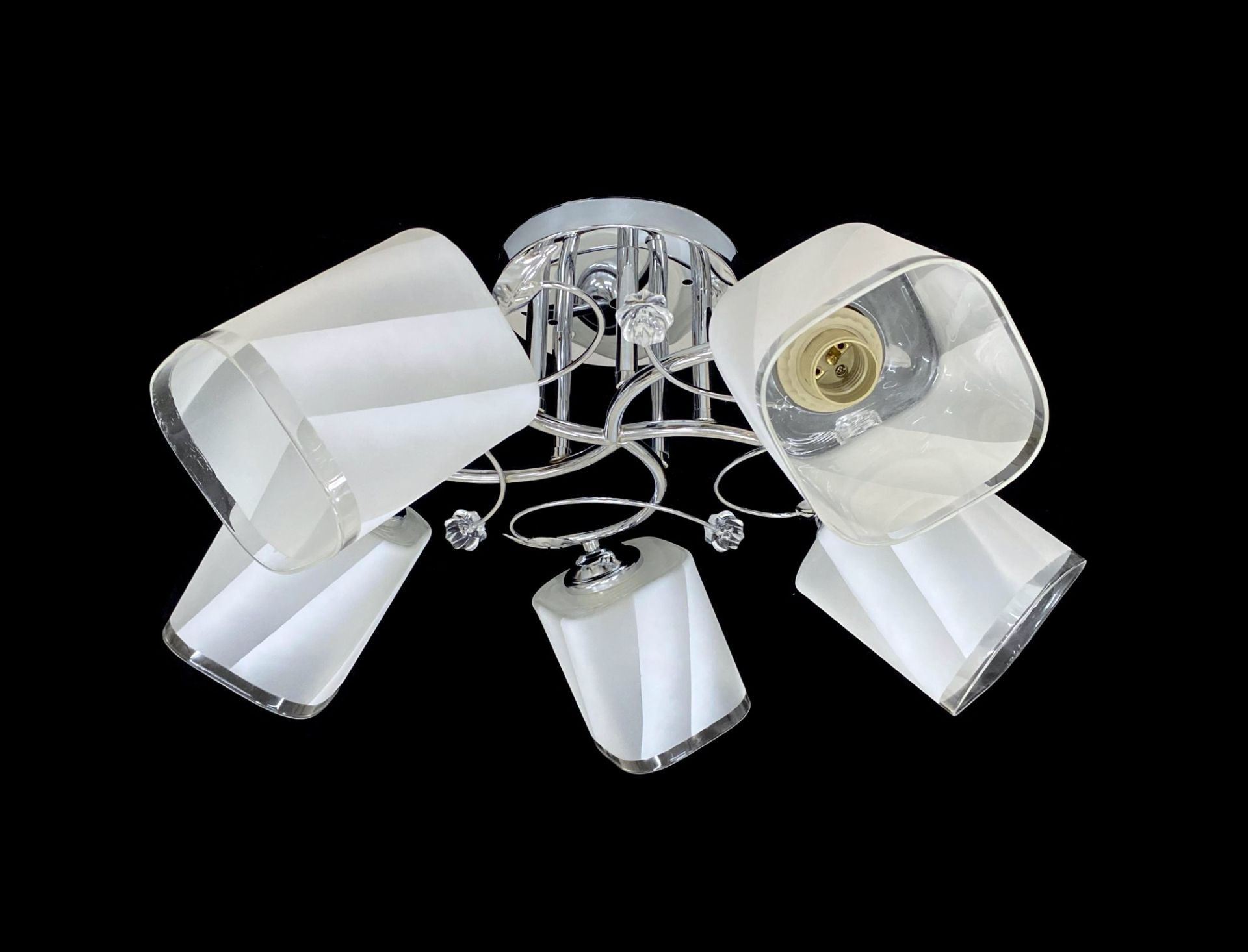 Эта стильная потолочная люстра на 5 плафонов — идеальное сочетание функциональности и элегантного дизайна. Ее конструкция из прочной стали в цвете хром и пять светлых стеклянных плафонов создает современный и изысканный вид. Благодаря равномерному рассеиванию света, эта люстра обеспечивает комфортное и приятное освещение в любом помещении.
