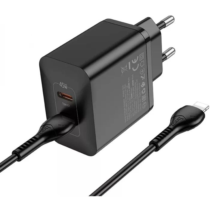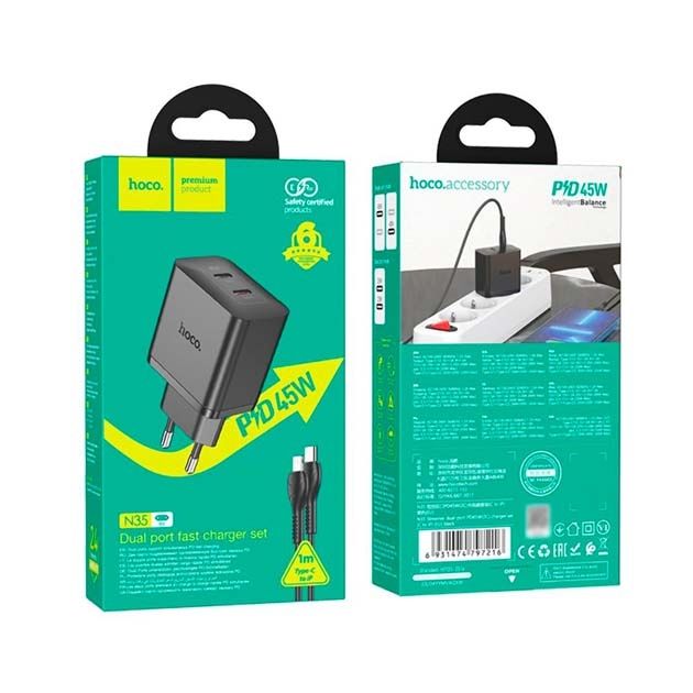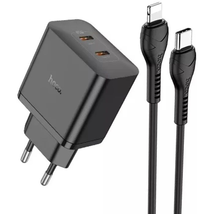 Сетевое зарядное устройство Hoco N35 2 Type-C PD 45W черное + кабель Type-C to Lightning