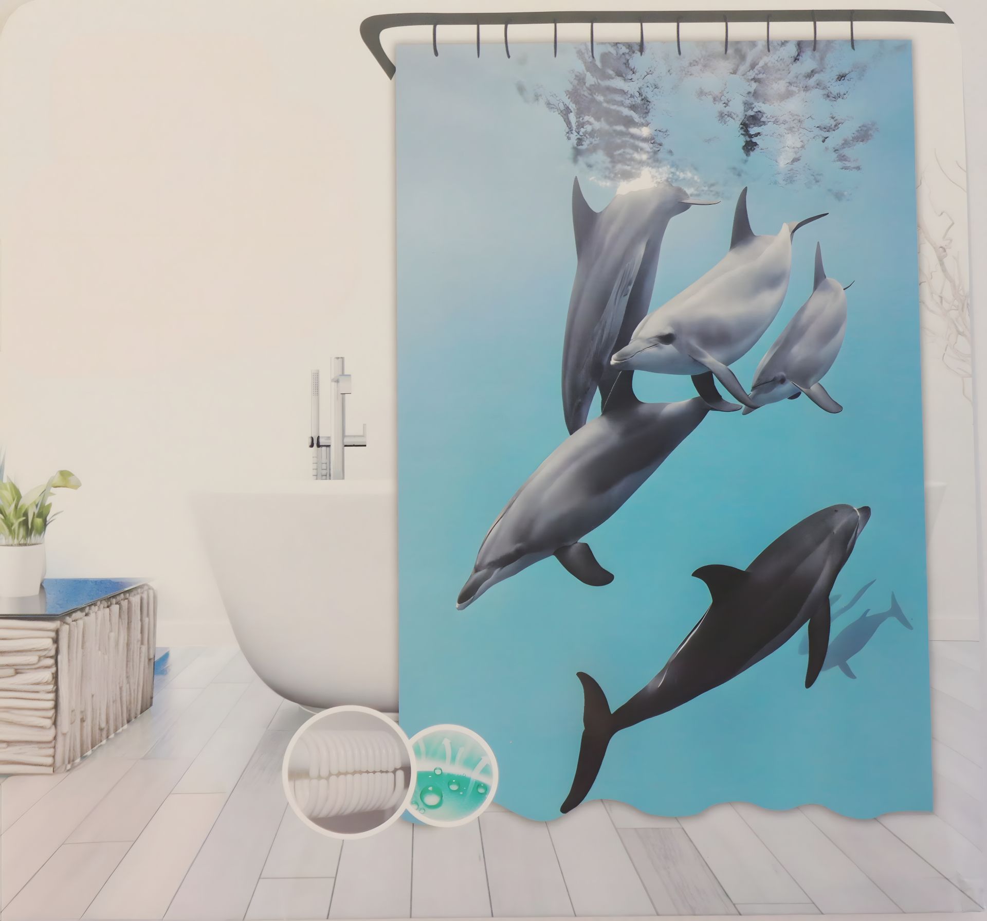 Практическая и стильная занавеска для душа изготовлена из высококачественного полиэстера, который не проходит воду и быстро высыхает. Благодаря плотному материалу, он защищает пол от брызг и создает удобные условия во время купания.