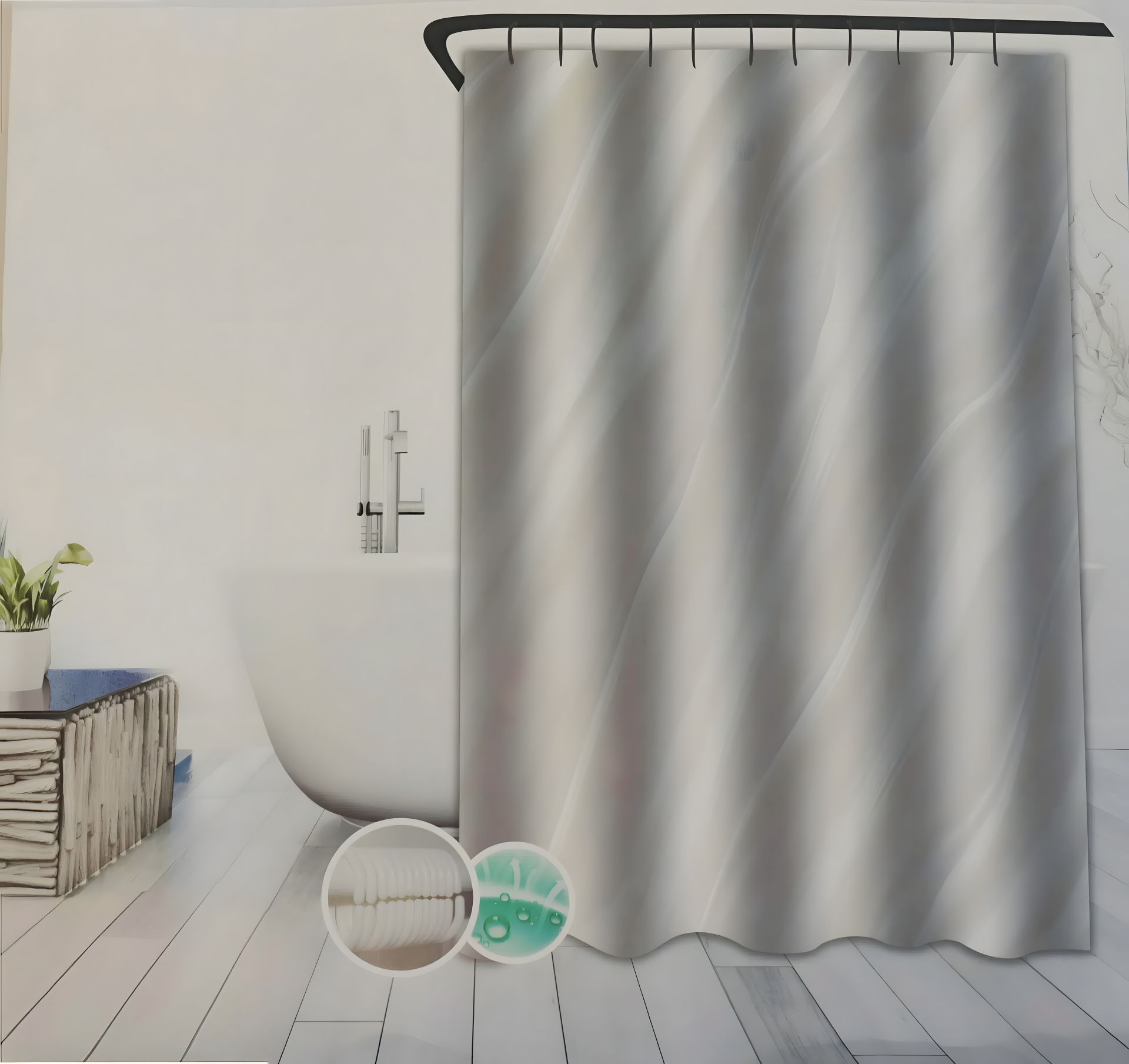 Практическая и стильная занавеска для душа изготовлена из высококачественного полиэстера, который не проходит воду и быстро высыхает. Благодаря плотному материалу, он защищает пол от брызг и создает удобные условия во время купания.