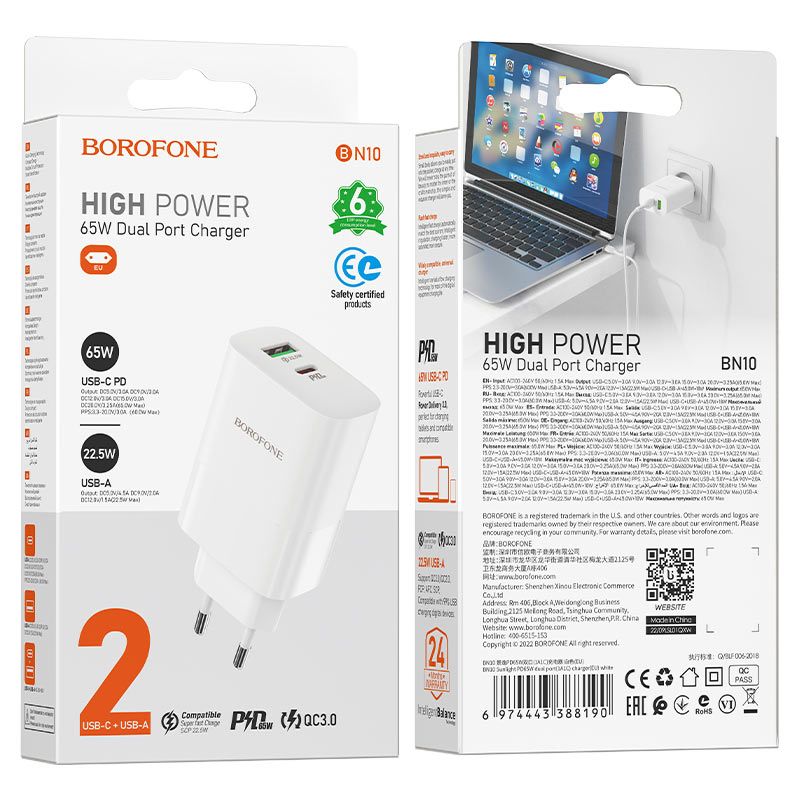 Сетевое зарядное устройство Borofone BN10 USB/ Type-C PD 65W белое