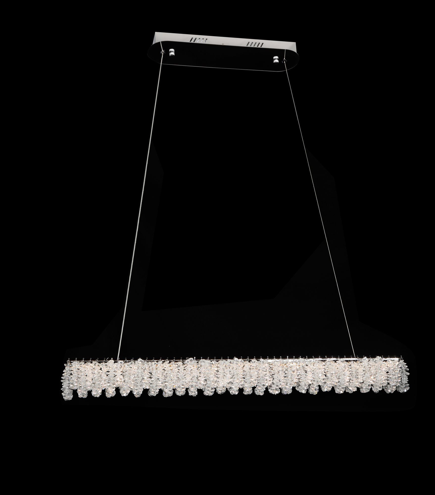 Изысканная подвесная светодиодная люстра VALESO 33038/850*50 в ослепительном хромовом цвете — это элегантный акцент для современного пространства. Люстра имеет удлиненную, минималистичную форму (50*850 мм), идеально подходящую для освещения барной стойки или обеденного стола. Корпус светильника выполнен из блестящего металла, украшенного высококачественным хрусталем, что создает эффектное мерцание и придает интерьеру роскоши.