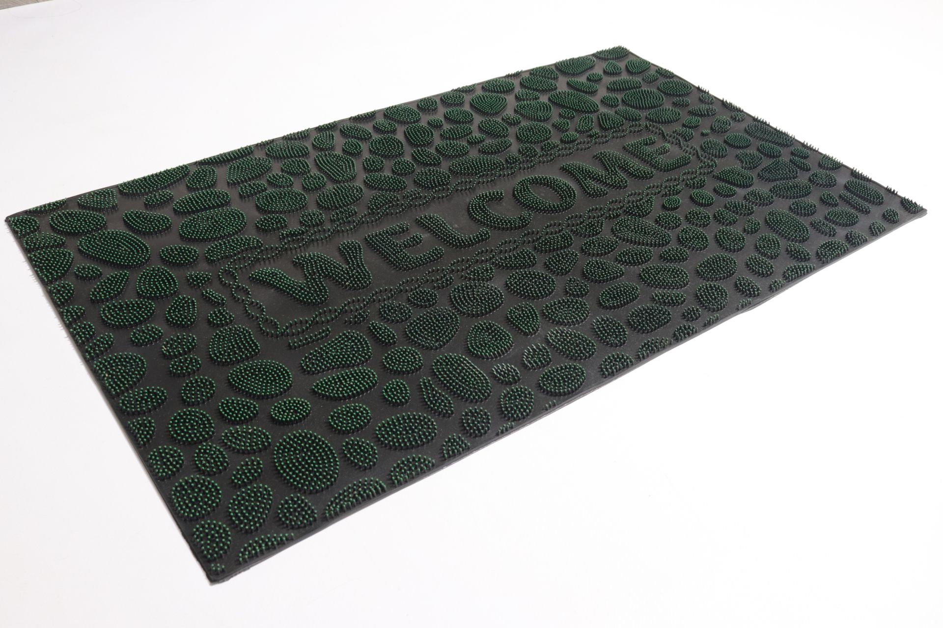Резиновый резиновый коврик. Размер 45*75 см. Приветствующая надпись и рисунок гальки. Изготовлен из упругой резины с нанесенной краской для декора. Вес 1,4 кг.