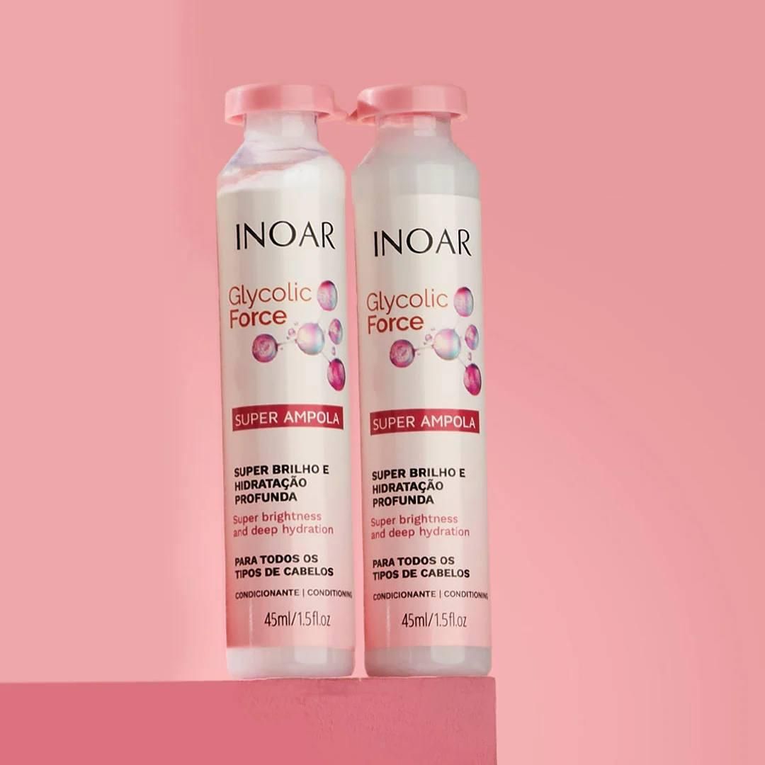 INOAR Glycolic Force — ампула для интенсивного восстановления волос после окрашивания, осветления, термовоздействия и стилизации; подходит для всех типов, включая пористые и истонченные, можно использовать как экспресс-уход между процедурами.