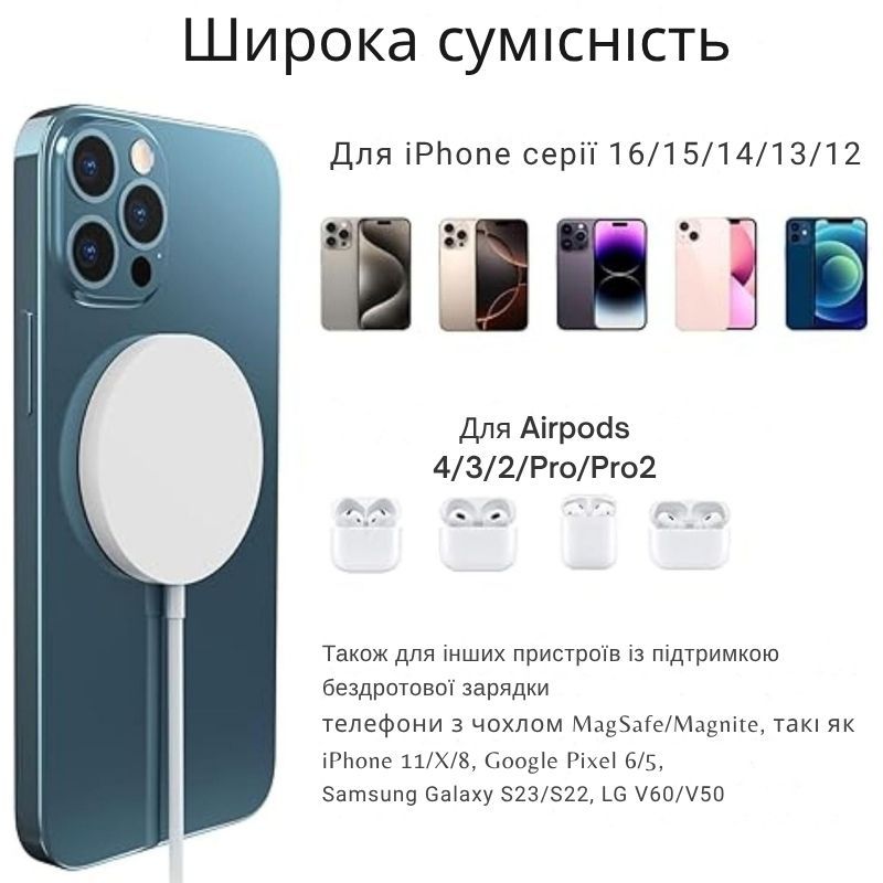 Встроенная защита от перегрева, перенапряжения и перезарядки гарантирует безопасность устройства. Поддерживает модели iPhone 12–15 и Airpods Pro.