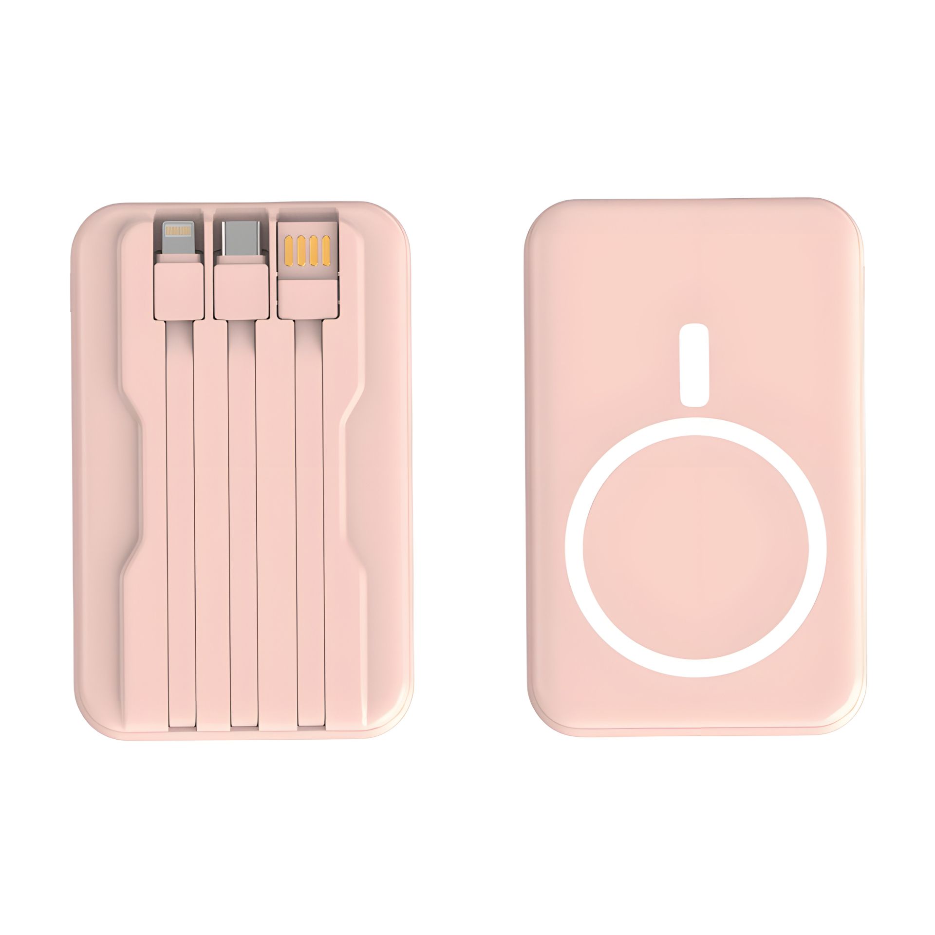 MagSafe повербанк 10000 мАч LX-DX126 с магнитной зарядкой, LED-дисплеем и встроенными кабелями (Lightning/Type-C/USB) розового цвета