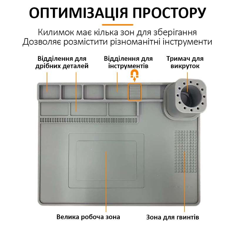 - Коврик оснащён множеством отсеков и ячеек для винтов, деталей и инструментов, что обеспечивает порядок и удобство в работе.