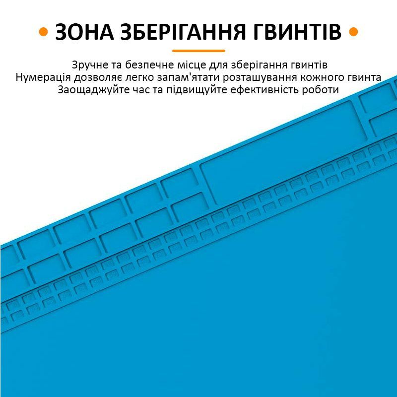 - Поверхность коврика оснащена встроенными секциями, ячейками и углублениями, которые позволяют аккуратно размещать инструменты, винты, микросхемы и другие мелкие компоненты. Это значительно повышает удобство и эффективность работы, обеспечивая порядок на рабочем месте.