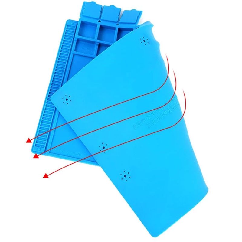 - Этот коврик изготовлен из прочного силикона, устойчивого к воздействию высоких температур, механическим повреждениям, царапинам и следам припоя. Он предотвращает ожоги и порчу поверхности от горячих инструментов.