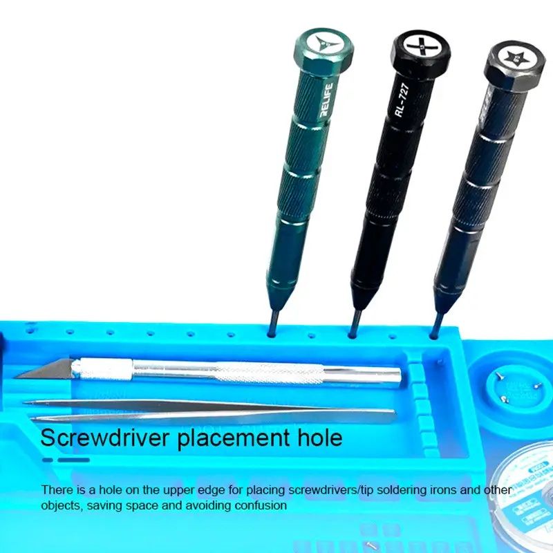 - Этот коврик оснащен множеством отсеков и ячеек для хранения винтов, гаек, компонентов и инструментов. Это обеспечивает порядок на рабочем месте и ускоряет процесс пайки.
