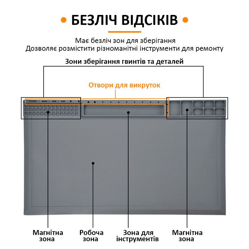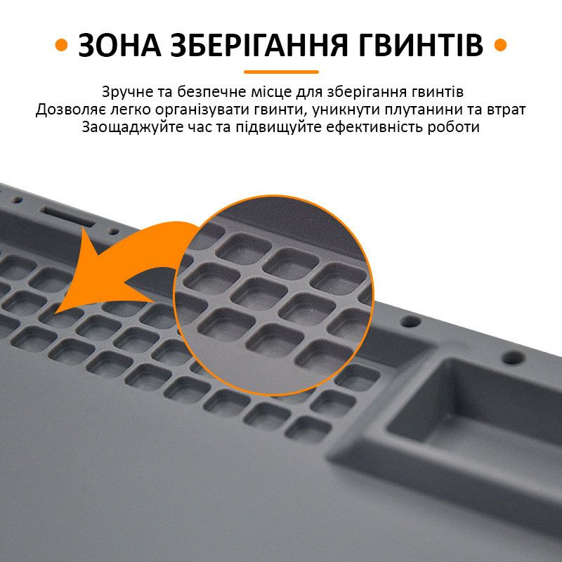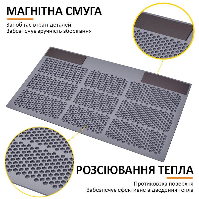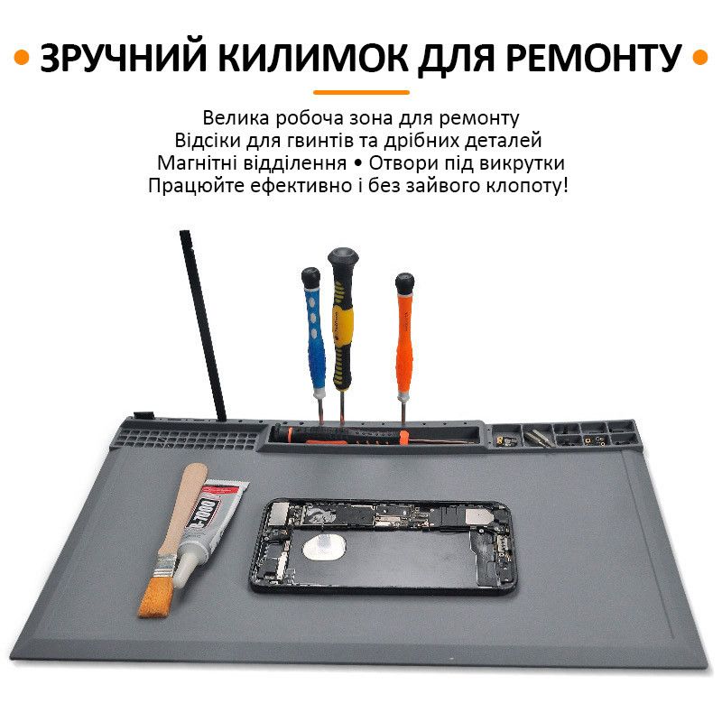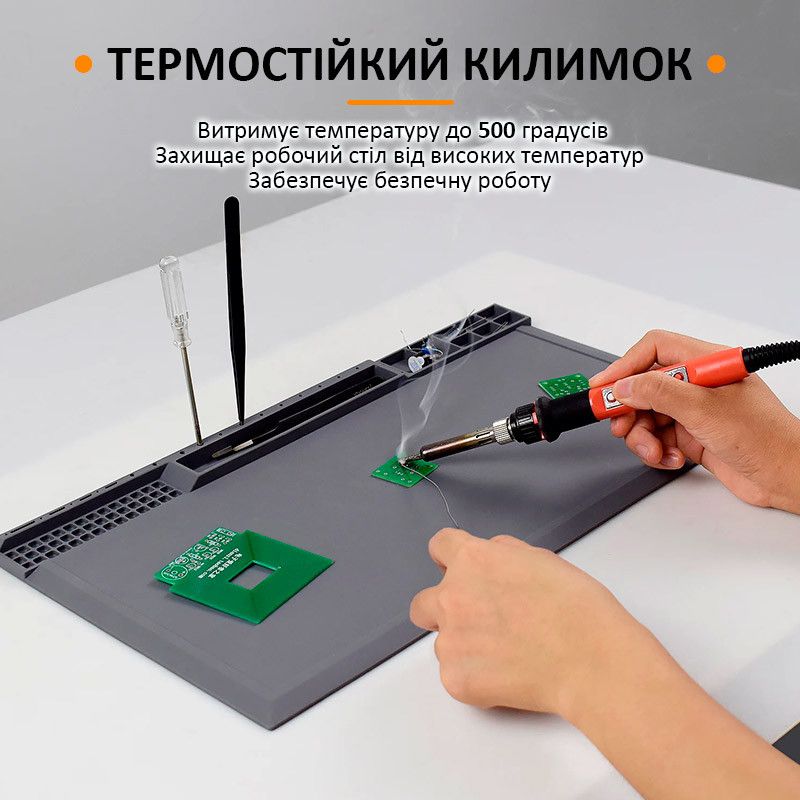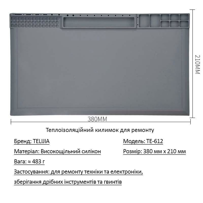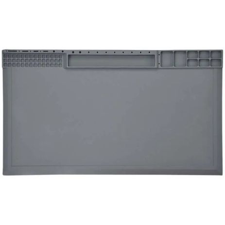 Силиконовый термостойкий коврик TELIJIA TE-612 – это незаменимый аксессуар для профессиональных мастерских и домашних рабочих мест. Он обеспечивает надежную защиту рабочей поверхности, организует инструменты и детали, а также повышает эффективность и безопасность пайки и ремонта электроники.