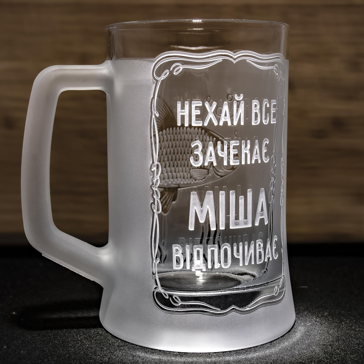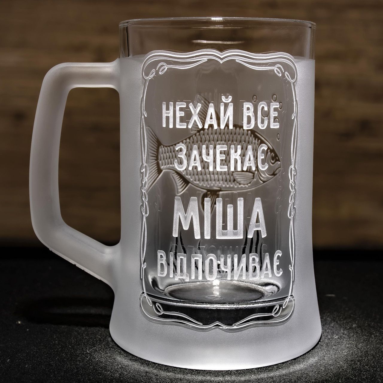 Именной пивной бокал с гравировкой Пусть все подождет... - оригинальный подарок для настоящего рыбака