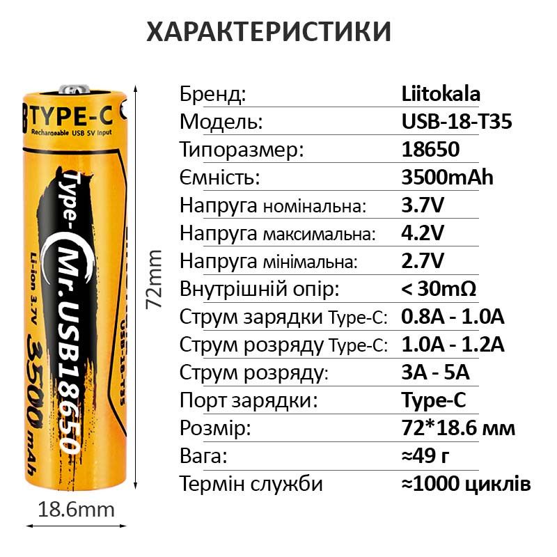 Аккумулятор LiitoKala USB-18-T35 / 18650 / 3500 mAh / Type-C Original
