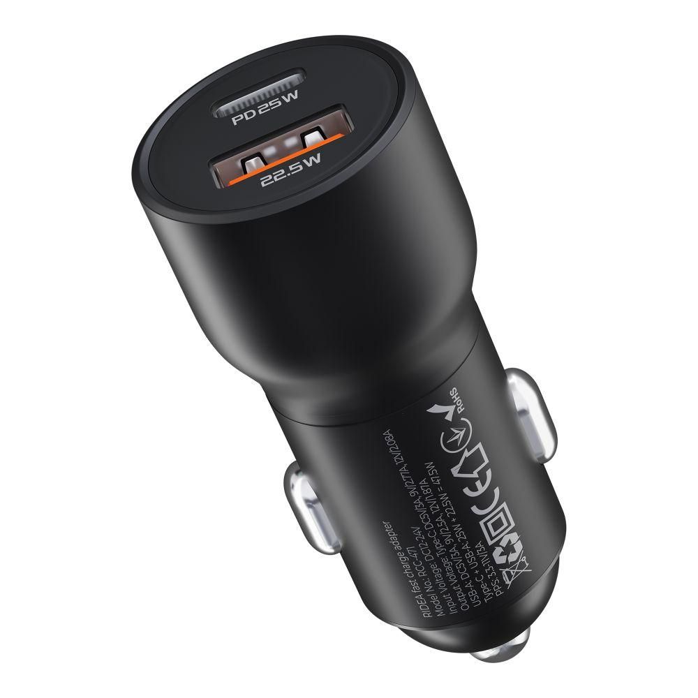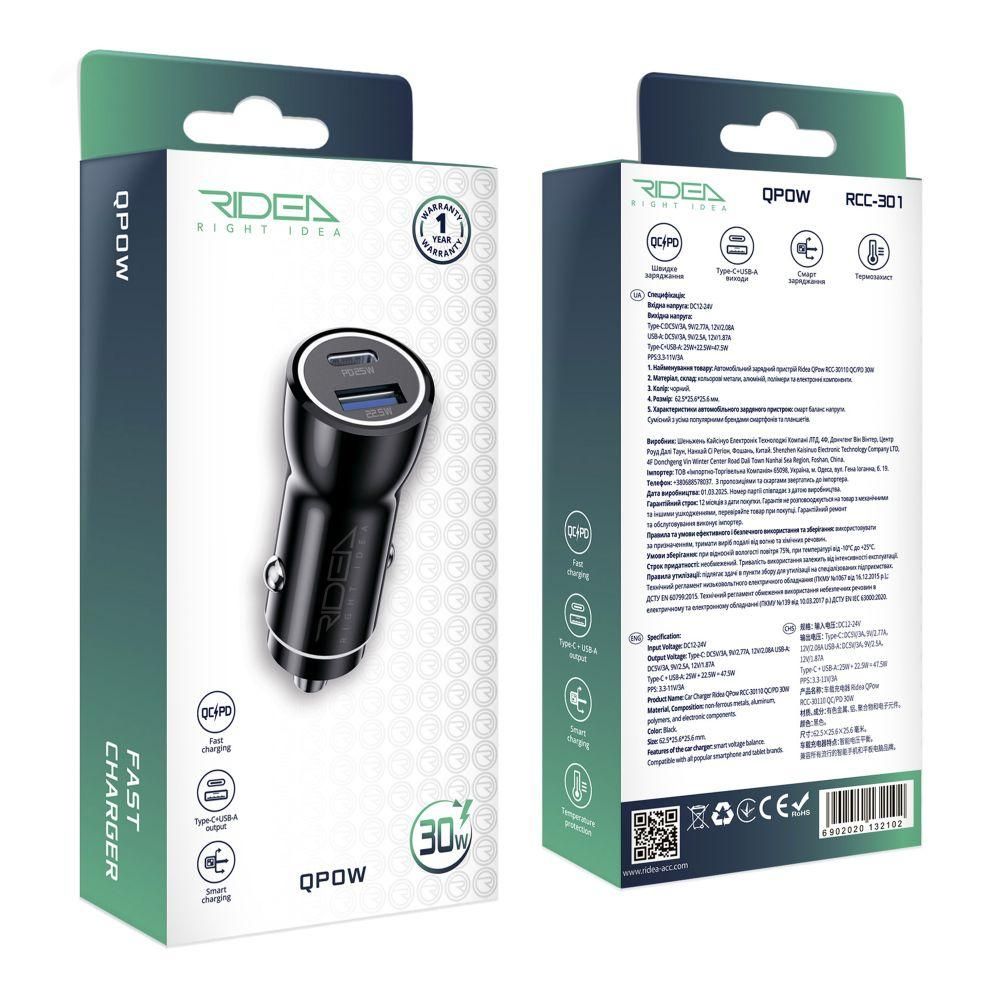 Зарядное устройство Ridea RCC-30110 Qpow – это надежный и мощный аксессуар, созданный для удобной зарядки портативных гаджетов прямо от гнезда прикуривателя автомобиля. Благодаря поддержке современных технологий быстрой зарядки и наличию двух портов, оно обеспечивает стабильную работу сразу с двумя гаджетами без потери эффективности. Особенности и преимущества зарядного устройства Ridea RCC-30110 Qpow: • Современный дизайн с привлекательным блеском глянцевой поверхности и контрастной матовой верхней панелью. • Компактные размеры: 62.5 × 25.6 × 25.6мм, - не мешает и не отвлекает внимание, лаконично вписываясь в салон авто. • Надежный корпус из ударопрочного пластика с качественными нижним и боковыми контактами из металла. • Точная форма, которая обеспечивает плотную посадку в гнездо прикуривателя, гарантируя стабильную работу. • Кольцевая LED-подсветка верхней панели, которая обеспечивает удобное использование в любое время суток. • Широкий диапазон входного напряжения: 12-24V, - обеспечивает совместимость с большинством современных авто. • 1 разъем USB-A и 1 разъем Type-C, общая максимальная мощность на выходе которых составляет 47.5W. • Максимальная мощность на выходе разъема USB-A: 22.5W (5V/3A, 9V/2.5A, 12V/1.87A). • Максимальная мощность на выходе разъема Type-C: 25W (5V/3A, 9V/2.77A, 12V/2.08A). • Поддержка адаптивной быстрой зарядки через разъем Type-C по технологии PPS с напряжением 3.3-11V при силе тока 3A. • Поддержка быстрой зарядки по протоколам QC и PD, которые обеспечивают ускоренную подачу энергии для совместимых устройств. • Технология интеллектуальной зарядки, которая автоматически определяет оптимальный режим подачи энергии. • Многоуровневая система защиты от перегрева, перегрузки, скачков напряжения и короткого замыкания. Зарядное устройство Ridea RCC-30110 Qpow станет надежным спутником в дороге, предлагая эффективную и безопасную подачу энергии для различных гаджетов.