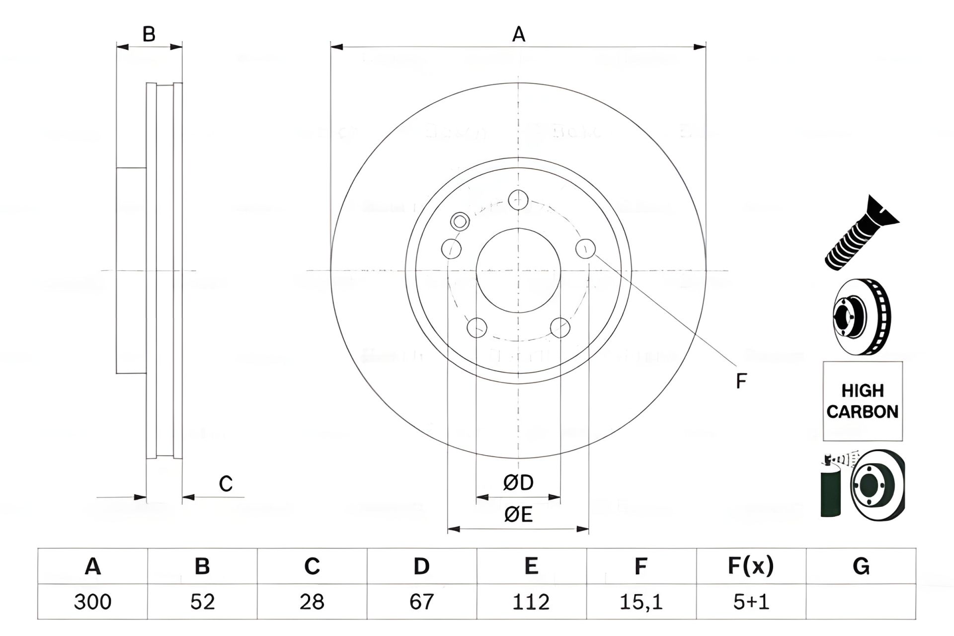 Количество отверстий : 5 Тип тормозного диска : вентилируемый Толщина тормозного диска (мм) : 28 Минимальная толщина [мм] : 25 Высота [мм] : 51,9 Ø фаски [мм] : 112 Диаметр центрирования [мм] : 67 выполняет нормы ЕЭК : ECE-R90 Обработка : Высокоуглеродистый Поверхность : с покрытием Диаметр отверстия до [мм] : 15 Наружный диаметр [мм] : 300 MERCEDES BENZ 4474210312 A4474210312 MERCEDES-BENZ MARCO POLO Camper (W447) 170 CDI (447.703) | Автобус | Дизель OM 622.851 | 75 kw | 102 hp | 06.2020-. MERCEDES-BENZ VITO Mixto (Double Cabin) (W447) 114 CDI (447.701, 447.703, 447.705) | Фургон | Дизель OM 622.851 | 100 kw | 136 hp | 09.2019-. MERCEDES-BENZ VITO Фургон (W447) 114 CDI (447.601, 447.603, 447.605) | Фургон | Дизель OM 622.851 | 100 kw | 136 hp | 09.2019-. MERCEDES-BENZ VITO Фургон (W447) 110 CDI (447.601, 447.603, 447.605) | Фургон | Дизель OM 622.851 | 75 kw | 102 hp | 09.2019-. MERCEDES-BENZ eVITO Tourer (W447) Electric (447.703, 447.705) | Автобус | электричество EM 780.701 | 85 kw | 116 hp | 04.2019-. ME