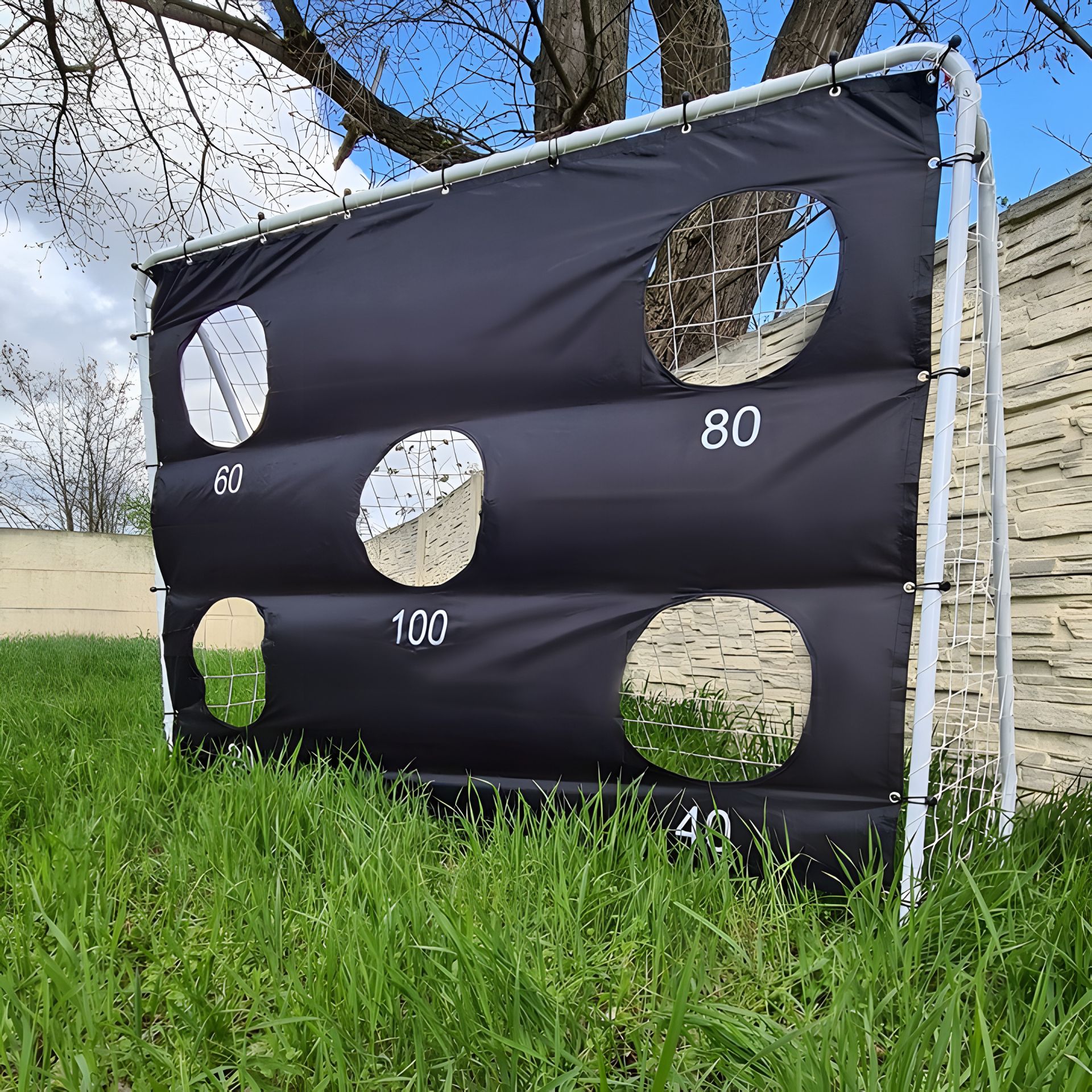 - ПРИЦЕЛЬНЫЙ КОВРИК – к воротам добавляется прицельный коврик для отработки точных ударов. Когда вы поставите его на ворота, будет всего 5 видимых мест, через которые вы можете забить гол. Каждой лунке присваивается определенное количество баллов. Панель крепится с помощью специальных входящих в комплект резинок.