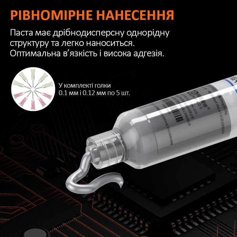 - Эта паста имеет однородную текстуру и стабильную вязкость, благодаря чему легко наносится даже на микроскопические контакты.