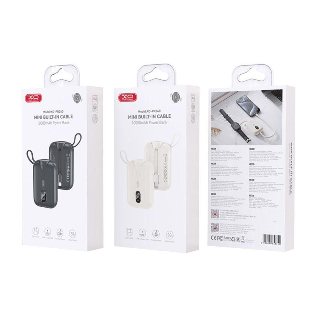 Power Bank XO PR260 — это мощная и функциональная мобильная батарея, разработанная с использованием современных технологий для удобной и эффективной зарядки портативных гаджетов. Он отличается оригинальным дизайном, надёжностью и практичными техническими особенностями — поддержкой проводной быстрой зарядки и беспроводной зарядки смарт–часов. Особенности и преимущества универсальной мобильной батареи XO PR260: • Уникальный дизайн с удобно расположенным функционалом и обтекаемой формой с приятной на ощупь матовой поверхностью. • Компактные размеры: 80×60×27мм, — в сочетании со встроенным кабелем–ремешком обеспечивают удобное использование. • Качественные электронные компоненты и надёжная сборка корпуса из комбинации ABS–пластика и поликарбоната. • Современный литий–полимерный аккумулятор ёмкостью 10000mAh с увеличенным ресурсом циклов разряда–заряда. • Механическая кнопка и цифровой LED–дисплей, который точно и чётко отображает уровень заряда в процентах. • Встроенный плоский кабель с выходным разъёмом Type–C, который аккуратно уложен в слоте на задней панели. • Встроенный плоский кабель со съёмной круглой площадкой для беспроводной зарядки смарт–часов с выходной мощностью 2W. • Универсальный разъём Type–C, который может работать и на вход, и на выход. • Поддержка быстрой зарядки по протоколам SAMSUNG 5V/2A, DCP–1.5A, QC2.0/3.0, FCP, AFC на входе разъёма Type–C с мощностью до 18W (5V/2A, 9V/2A, 12V/1.5A). • Поддержка быстрой зарядки по протоколам APPLE 2.4A, PD2.0/3.0, PPS, SAMSUNG 5V/2A, DCP–1.5A, QC2.0/3.0, FCP, AFC на выходе каждого из разъёмов Type–C с мощностью до 20W (5V/2A, 9V/2.22A, 12V/1.67A). • Общая максимальная мощность на выходе: 10W (5V/2A). • Многоуровневая система защиты от перегрева, перегрузки, перезаряда, переразряда, скачков напряжения и короткого замыкания. XO PR260 — это мобильная батарея нового поколения, в которой удачно сочетаются компактные габариты, высокое качество исполнения и поддержка актуальных стандартов быстрой зарядки.