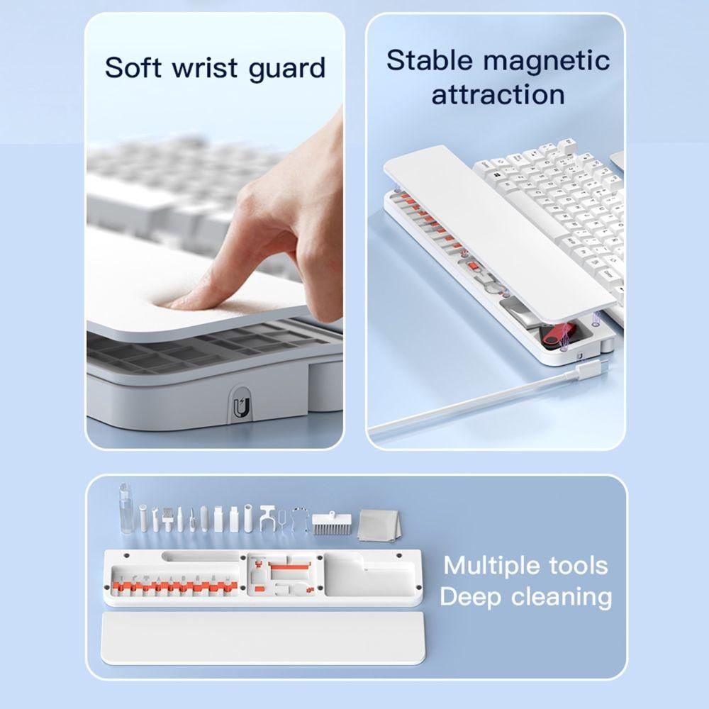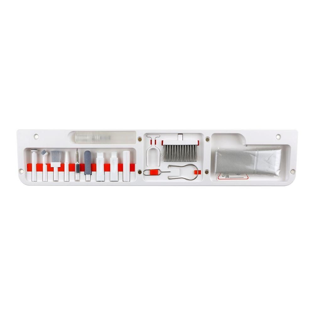 Универсальный набор для чистки 15 в 1 — это практичное решение для комплексного ухода за цифровыми устройствами и организации комфортной работы. Благодаря функциональному боксу в виде подставки под запястья, он не только помогает поддерживать идеальную чистоту клавиатуры, монитора или TWS–наушников, но и снижает усталость рук при длительной работе за клавиатурой. Особенности и преимущества универсального набора для чистки 15 в 1: • Современный, минималистичный, выполненный с акцентом на простоту повседневной эксплуатации и функциональность. • Оптимальные размеры: 360×73×23мм, — вмещает сразу 15 аксессуаров и позволяет удобно расположить запястья обеих рук. • Корпус бокса–подставки из ударостойкого пластика и качественные аксессуары из прочных, стойких к износу материалов. • Съёмная верхняя панель бокса на магнитах с мягкой накладкой и отделкой из приятной на ощупь искусственной кожи. • Магниты на боковых гранях для фиксации разъёмов кабелей или различных мелких металлических предметов. • 2 складные подставки для удобного и устойчивого расположения смартфонов под углом параллельно верхней грани бокса. • Эргономично распределённое внутреннее пространство со слотами для хранения аксессуаров и их удобного извлечения. • Щётки разной длины и формы для удаления пыли и эффективной чистки разъёмов, наушников и других гаджетов. • Удлинитель для удобного доступа к труднодоступным местам и металлическое перо для аккуратного удаления сложных загрязнений. • Жидкость в форме спрея и текстильная салфетка для протирки экрана и линз. • Скрепка для извлечения SIM–карты, а также ключи–съёмники для кейкапов и механических переключателей клавиатуры. Подробная комплектация: подставка под запястья, бокс для хранения, спрей, щётка для линзы камеры, малая изогнутая щётка, тонкая мягкая щётка, инструмент для очистки щелей, щётка для наушников, перо для точечной чистки, флокированный спонж, инструмент для чистки разъёма Type-C, инструмент для чистки кабеля Type-C, инструмент для чистки разъёма iPhone, инструмент для чистки кабеля Apple, удлиняющий стержень, съёмник кейкапов, скрепка для извлечения SIM–карты, съёмник переключателей, широкая щётка, салфетка для очистки экрана, инструкция. Универсальный набор для чистки 15 в 1 делает процесс очистки быстрым, аккуратным и эффективным, а рабочее место — более удобным и эргономичным.