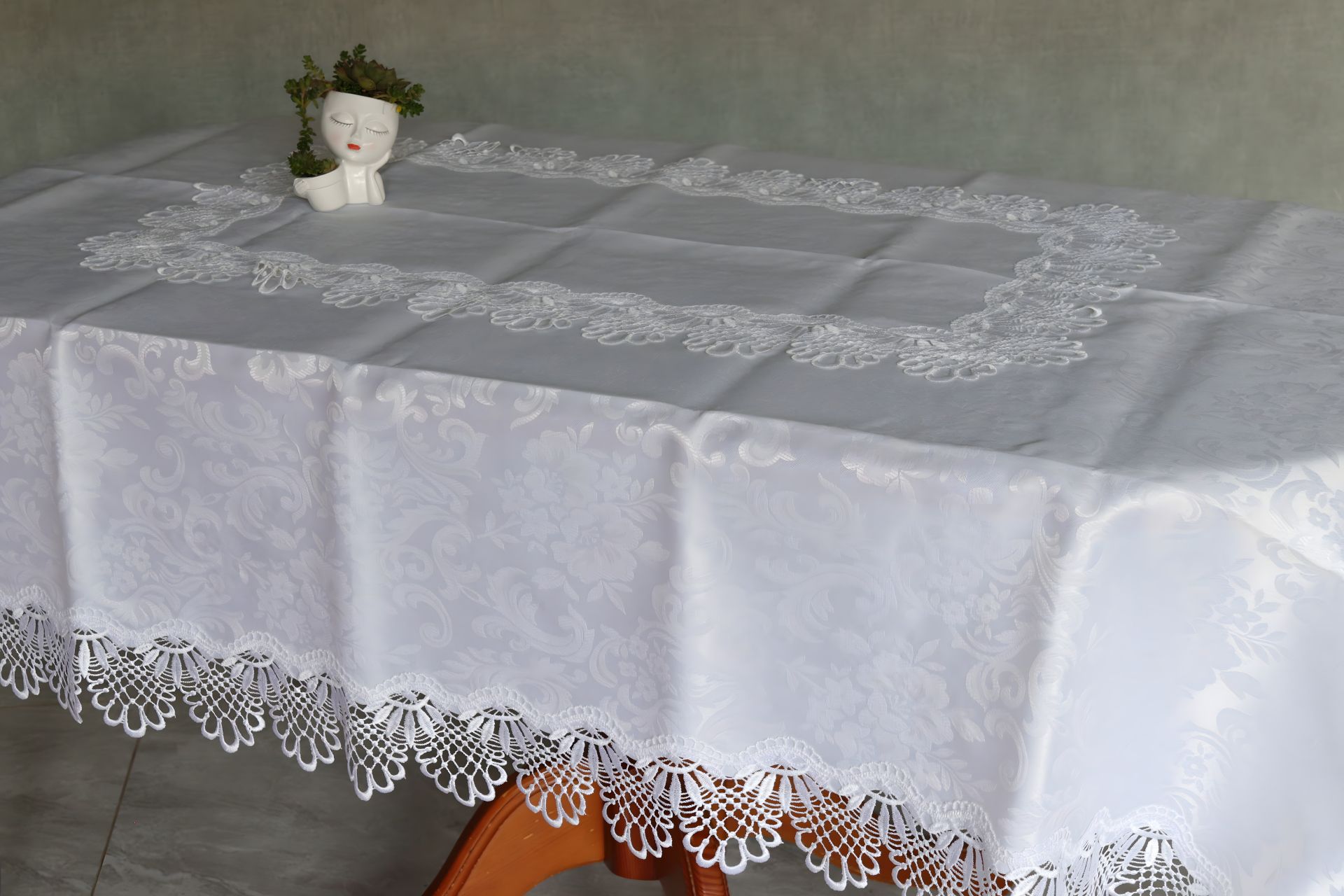 Скатерть тканевая с кружевом по краям и в центре. Размер 150*220 см. Состав - 100% полиэстер. Плотный, приятный на ощупь и простой в уходе (не теряет форму и цвет после стирки).
