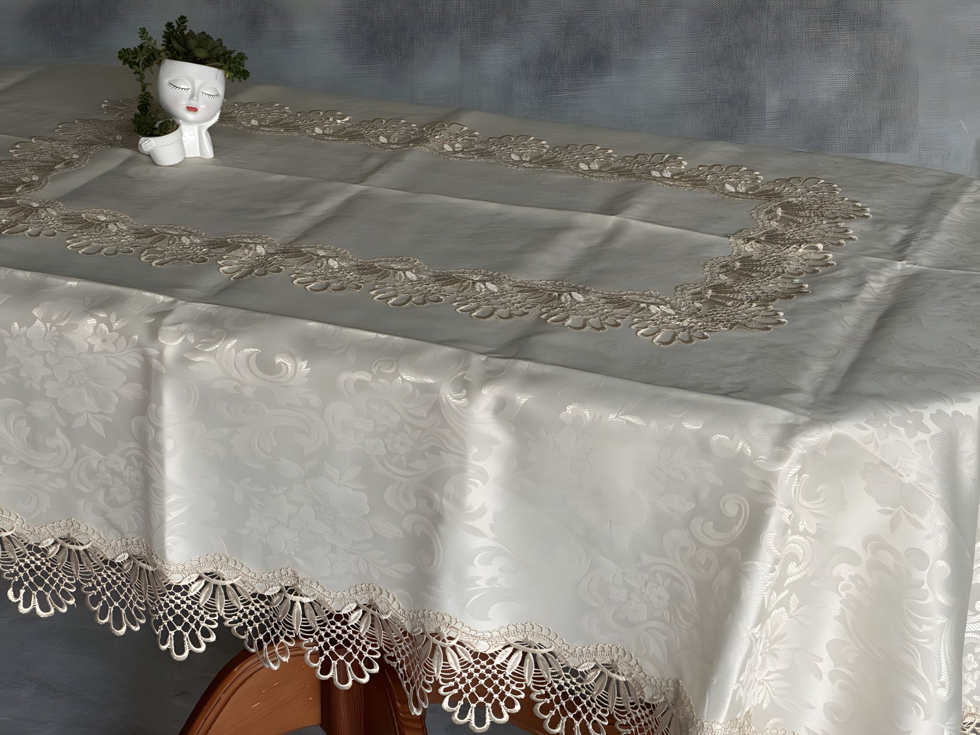 Скатерть тканевая с кружевом по краям и в центре. Размер 150*220 см. Состав - 100% полиэстер. Плотный, приятный на ощупь и простой в уходе (не теряет форму и цвет после стирки).